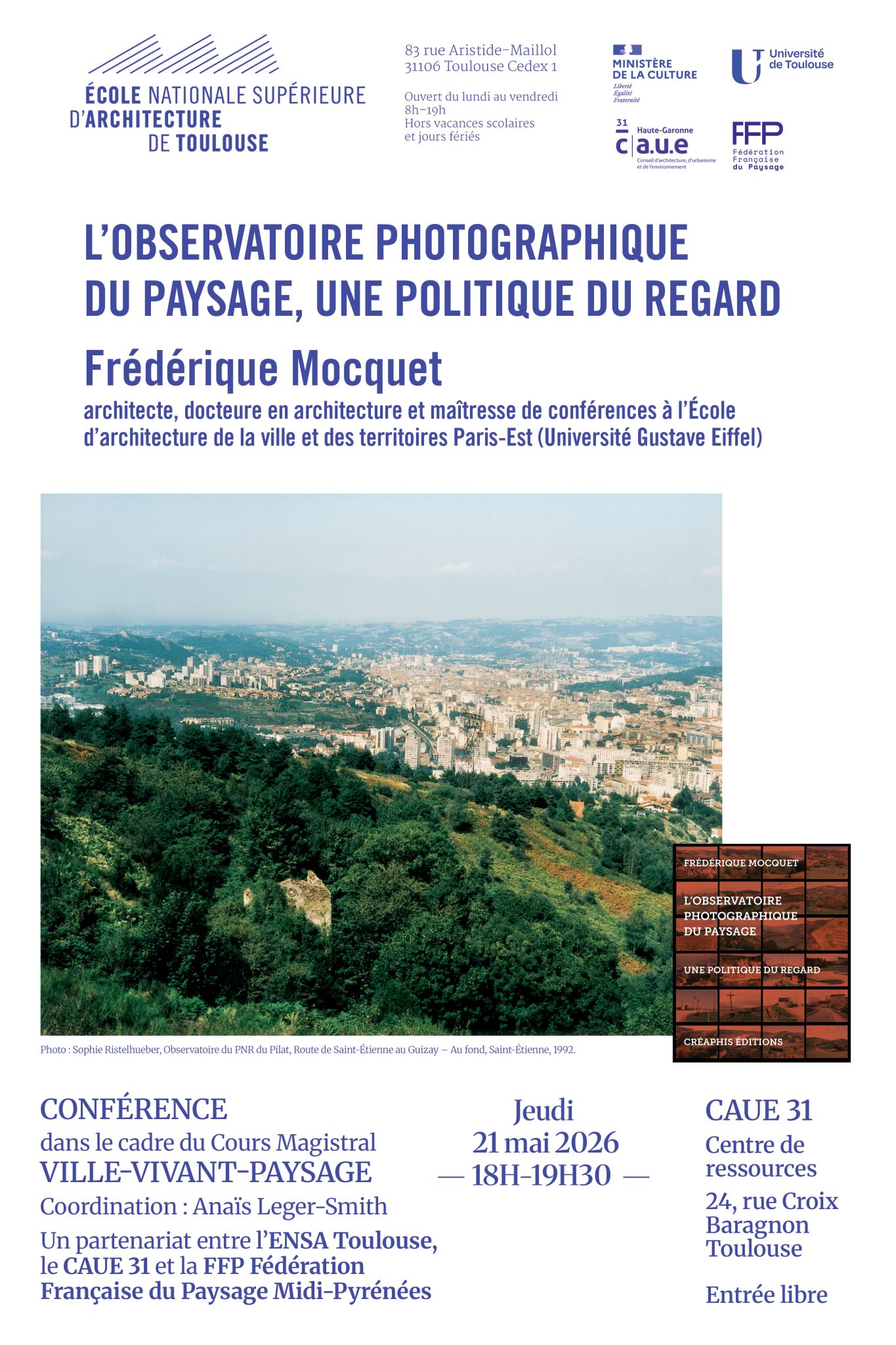 Nous sommes heureux de vous convier à la présentation de l’ouvrage de Frédérique Mocquet le Jeudi 21 Mai 2026, 18h/19h30, au centre de ressources du CAUE 31, rue Croix Baragnon à Toulouse. En partenariat entre l’ENSA Toulouse, le CAUE 31 et la FFP Fédération Française du Paysage Midi-Pyrénées Frédérique Mocquet est architecte, docteure en architecture et maîtresse de conférences depuis récemment à l’École Nationale Supérieure d’Architecture de Marseille (anciennement Ecole d’architecture de la ville et des territoires Paris-Est Université Gustave Eiffel).
