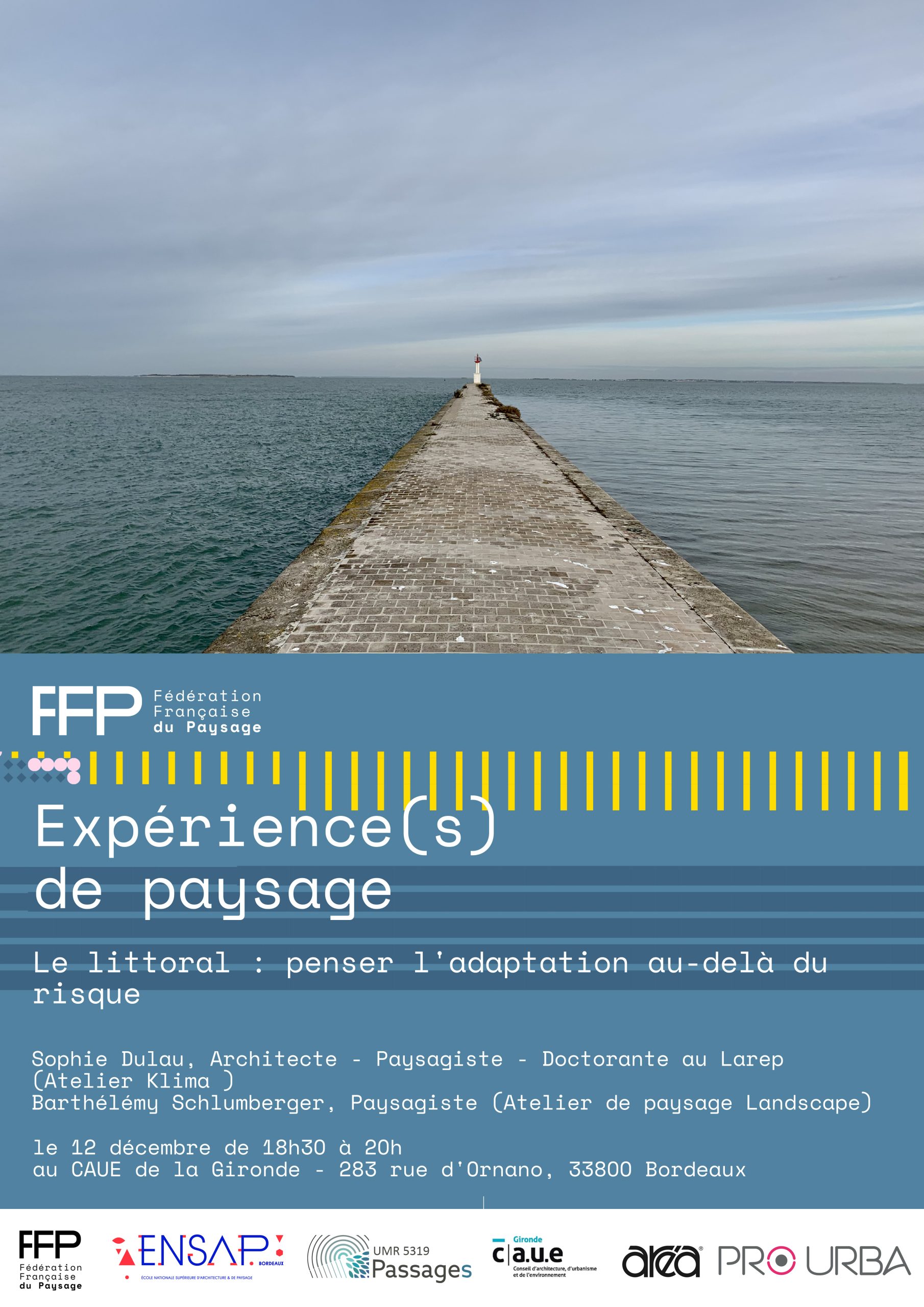 Conférence-débat dans le cadre des Expérience(s) de paysage, sur le thème "Le littoral : penser l'adaptation au-delà du risque", le 12 décembre 2023 au CAUE de la Gironde. Un événement co-créé avec la FFP Nouvelle-Aquitaine, l'ENSAP Bordeaux, le Laboratoire Passages et le CAUE GIRONDE, avec le soutien de Pro Urba et Area.