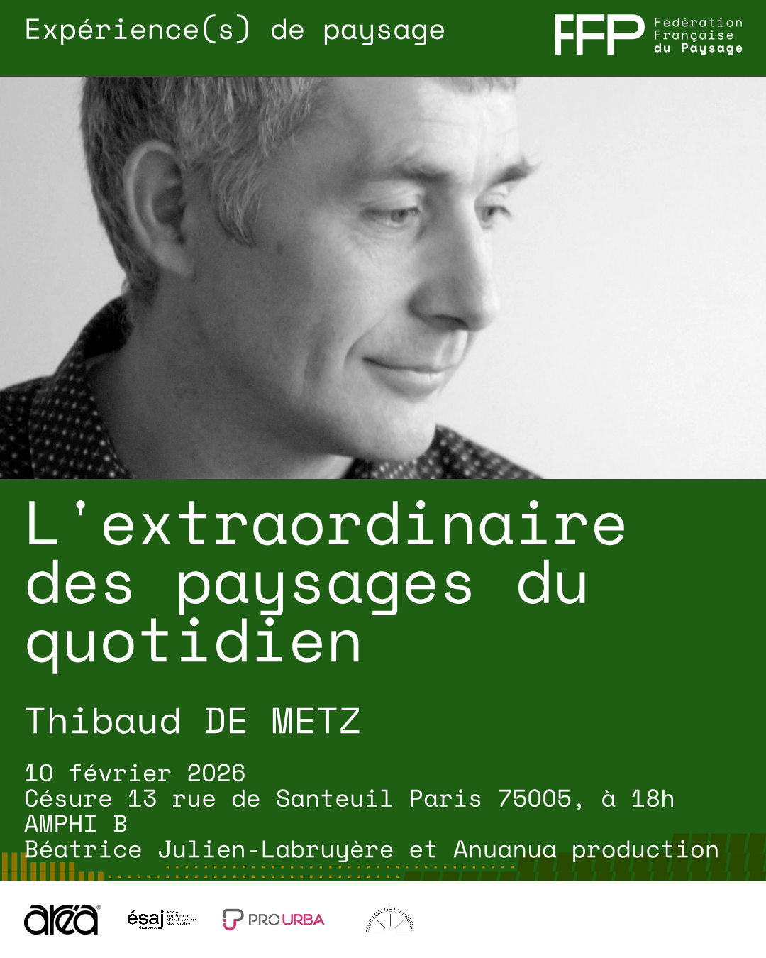 Conférence-débat dans le cadre des Expérience(s) de paysage, avec Thibaud de Metz, invité par Marc Claramunt, le 10 février 2026 à Césure 13, Paris. Un événement co-créé avec la FFP Île-de-France et l'esaj, avec le soutien de Area et Pro Urba