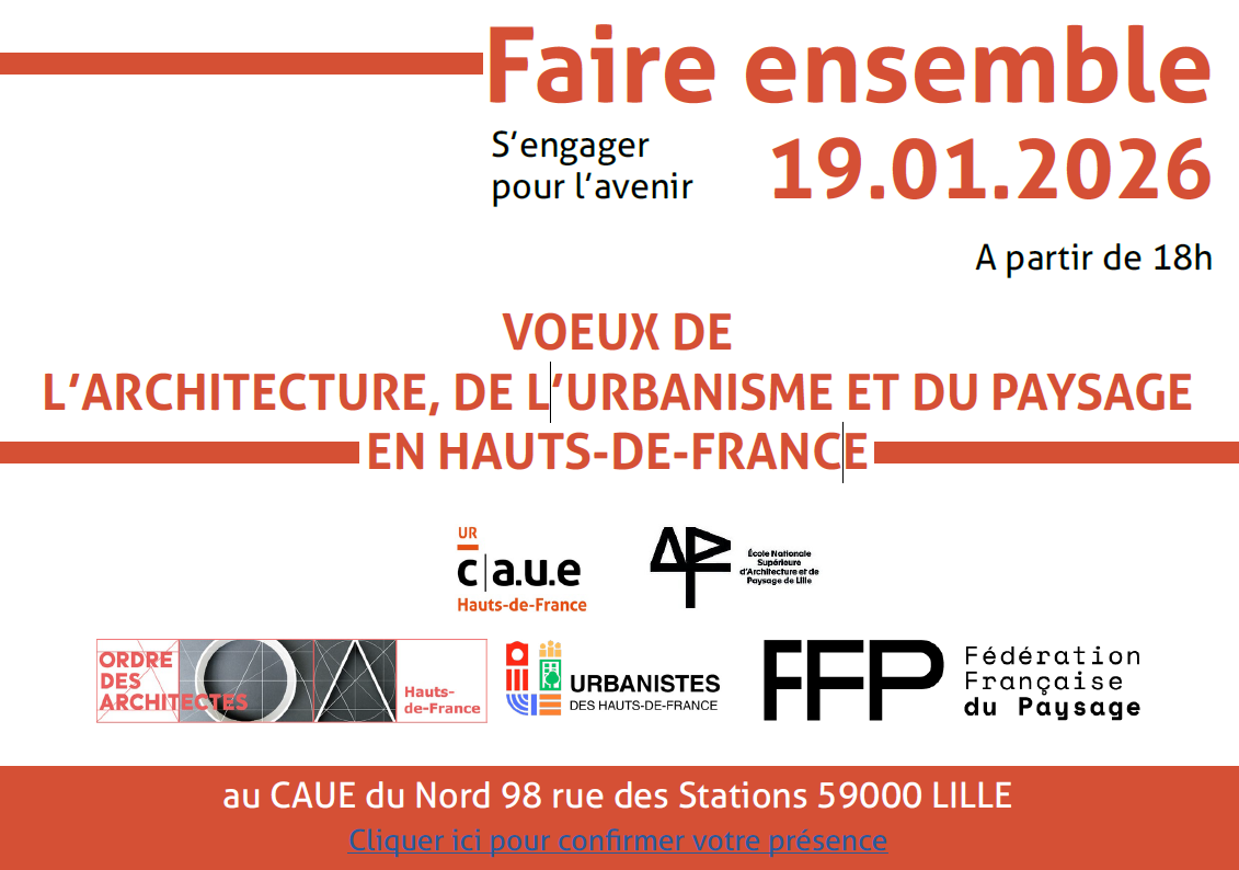 Cérémonie des vœux des acteurs et professionnels de l’architecture, de l’urbanisme & du paysage en Hauts-de-France, lundi 19 janvier 2026 à partir de 18h00 au CAUE du Nord – 98 rue des Stations – 59000 Lille