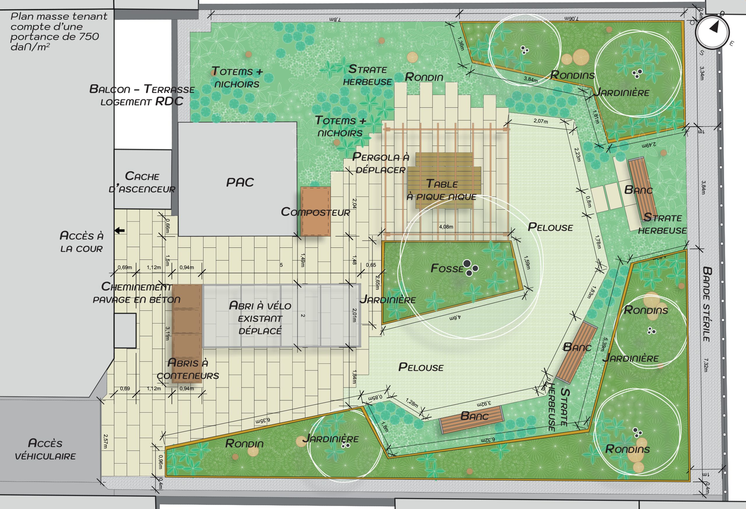 Du parking au jardin partagé : le projet d’aménagement de la cour opère une transformation radicale : cet espace autrefois entièrement minéral est converti en un véritable jardin partagé destiné aux résidents. Anciennement dédié au stationnement, cette cour sur dalle est réhabilitée pour devenir un lieu de vie, de détente et de biodiversité, s’inscrivant activement dans la lutte contre les îlots de chaleur urbains / Biodiversité et écologie au cœur du projet : l’aménagement se caractérise par la création d’une strate végétale diversifiée et étagée. En jouant sur des épaisseurs de substrats variées, le projet a permis l’intégration d’une riche palette végétale : des arbres de haute tige aux arbustes, en passant par des plantes herbacées. Cette conception favorise l’établissement d’un écosystème riche et apaisant / Favoriser le vivre-ensemble et la fonctionnalité : ce nouvel espace est conçu pour favoriser le partage et la convivialité. Des bancs et une pelouse invitent à la détente et à la pause, tandis qu’une grande table de pique-nique ombragée par une pergola constitue un lieu idéal pour les rassemblements collectifs.