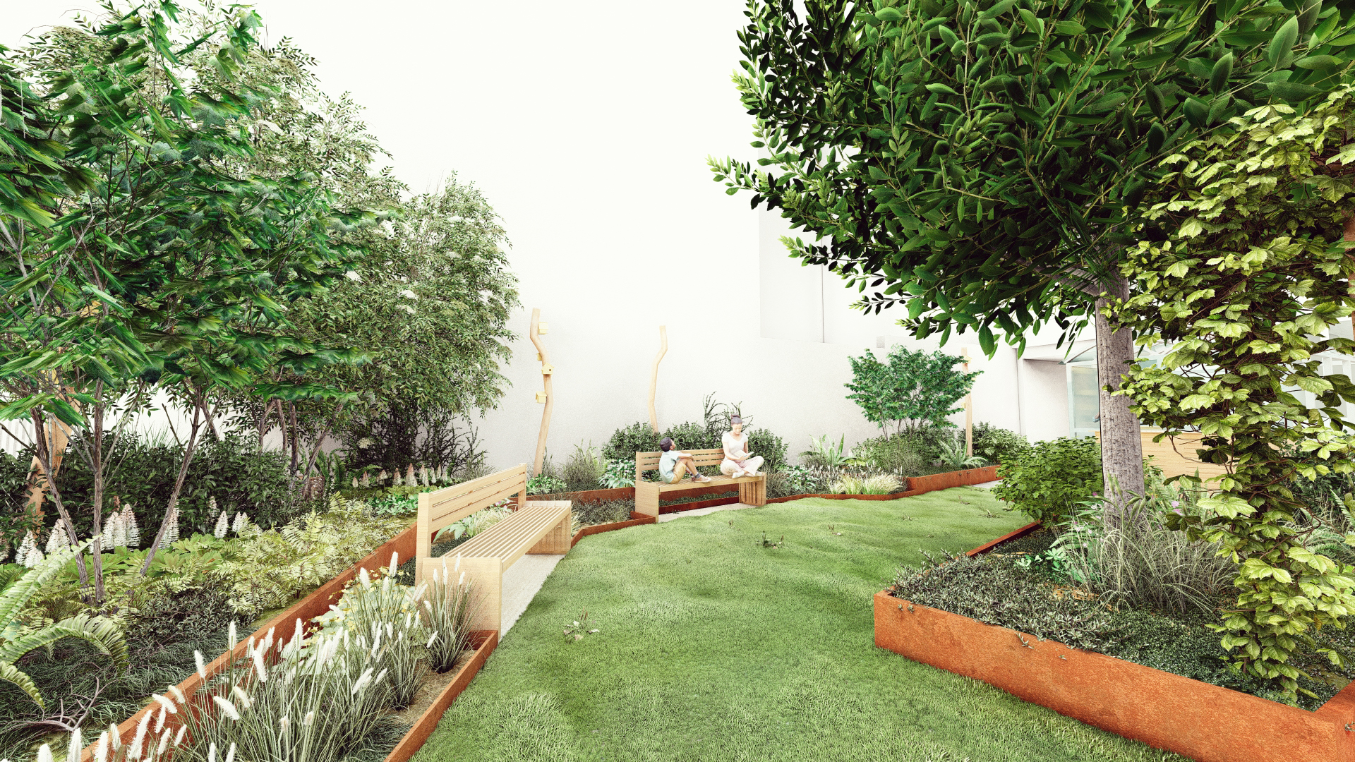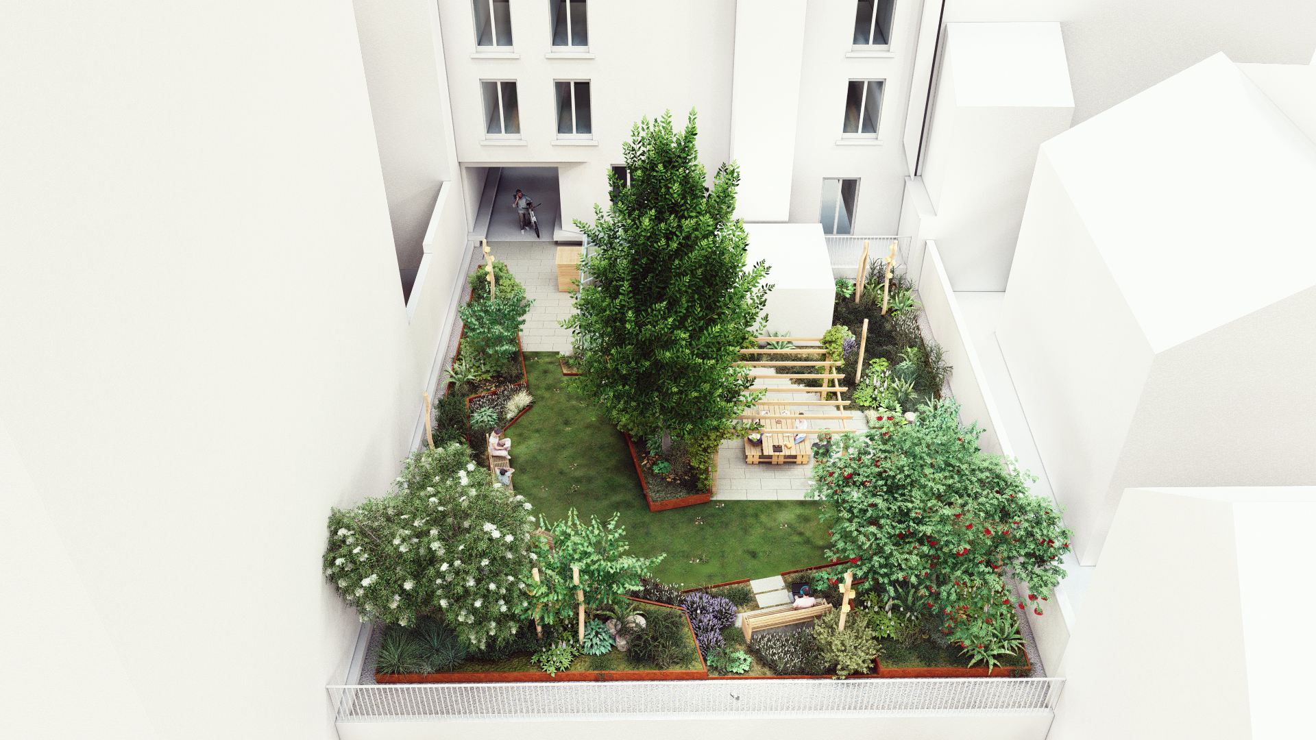 Cet aménagement repense l’usage traditionnel d’une cour d’immeuble, la métamorphosant en un lieu écologique, esthétique et hautement fonctionnel.