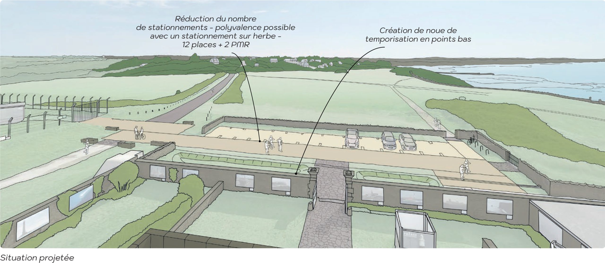 Stationnement 1 : Valoriser et accueillir. Cette première zone de stationnement constitue un SAS d’accueil pour le public avec un niveau de service à la hauteur des attentes du visiteur. Elle constitue une première image en transition entre la corniche habitée formant les faubourgs de Barneville, et ce site naturel / Stationnement 2 : fédérer et centraliser. Les abords du phare forment une entité centrale pour l’ensemble des visiteurs, peu importante le lieu de stationnement préalable. Cet espace sera considéré comme le cœur vivant et fédérateur.