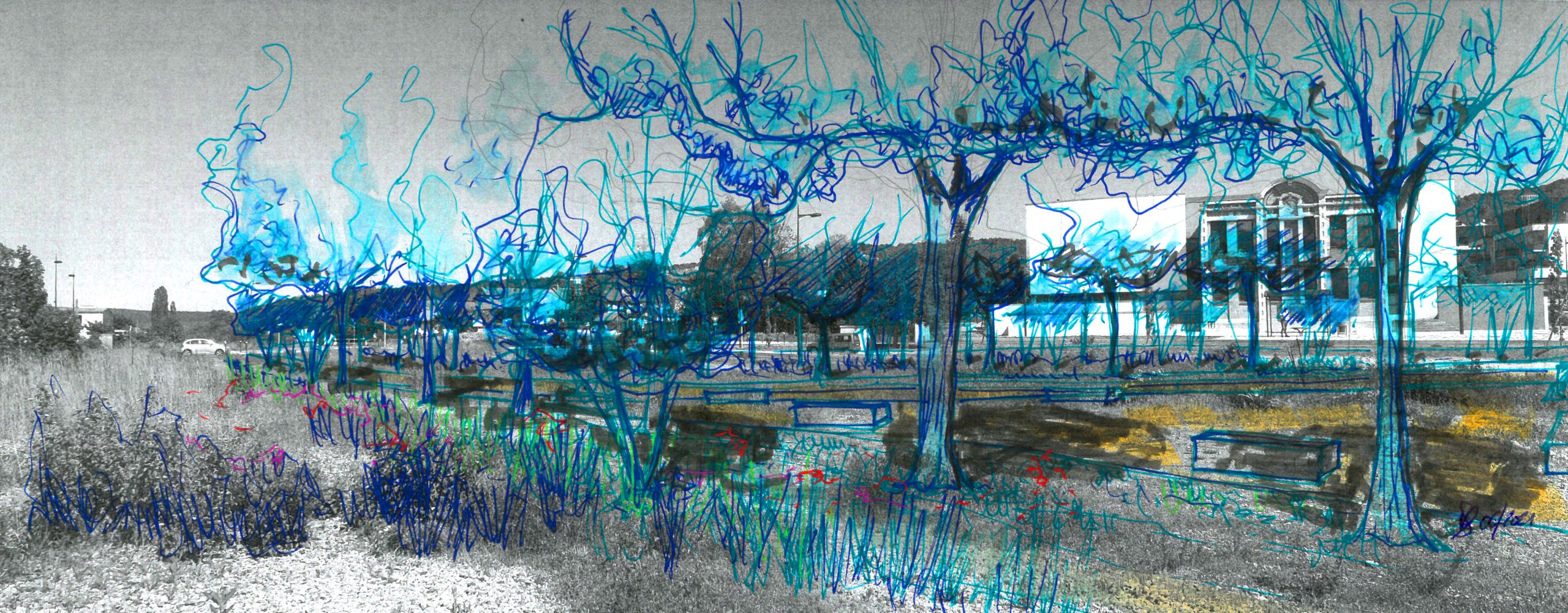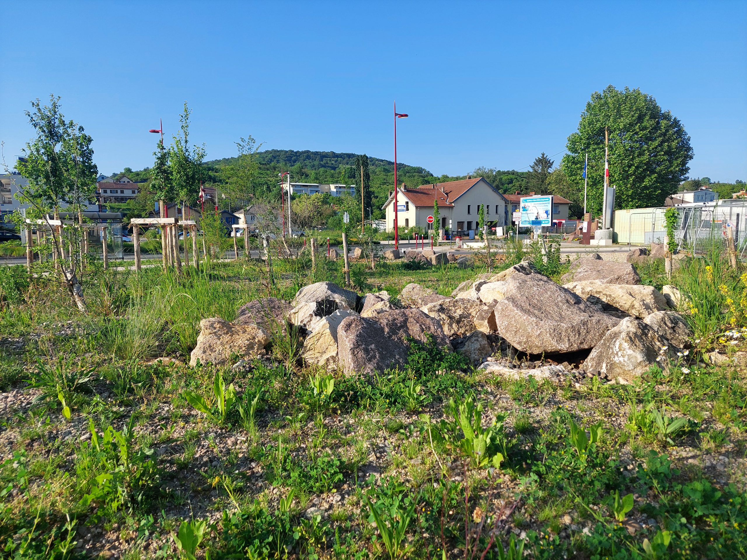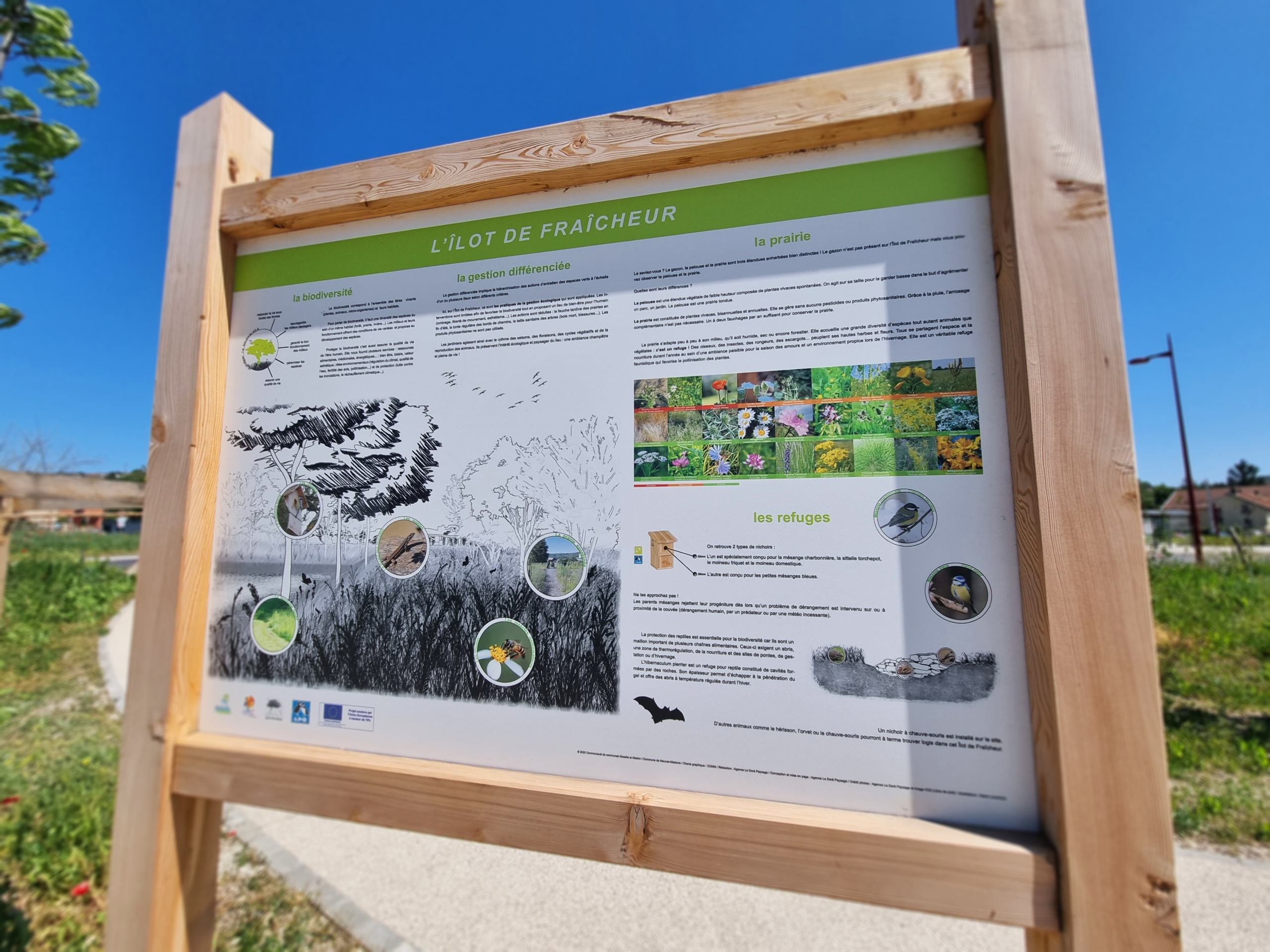 Les objectifs sont : – de créer un écrin de verdure au carrefour de plusieurs entités urbaines et dispositifs de déplacement – d’apporter une diversité des ambiances avec un cadre arboré et ombragé pour la promenade, le repos, les loisirs – d’offrir au coeur de ville un lieu pour la biodiversité. – de finaliser l’entrée de ville et faire «lien» – d’insérer des usages dans les espaces végétalisés techniques (bassin de compensation de crue) L’îlot de Fraîcheur offre : – une promenade (en béton) en connexion avec le réseau piétonnier et cyclable du quartier – un espace de convivialité (en stabilisé) pour le repos et les loisirs libres muni d’une fontaine – Une trame arborée dense pensée sur différentes strates, plantée avec des sujets d’âges et forces variés – Mise en place d’une gestion différenciée pour les prairies spontanées (avec support de communication) – un projet de plantation avec le travail du sol en place sans import de terre végétal : reconstitution d’un sol vivant avec apport d’amendement organique et bio-dynamisation. Un Fit Park accessible à tous est installé dans un bassin à proximité de l’îlot et en lien avec la piscine intercommunale.