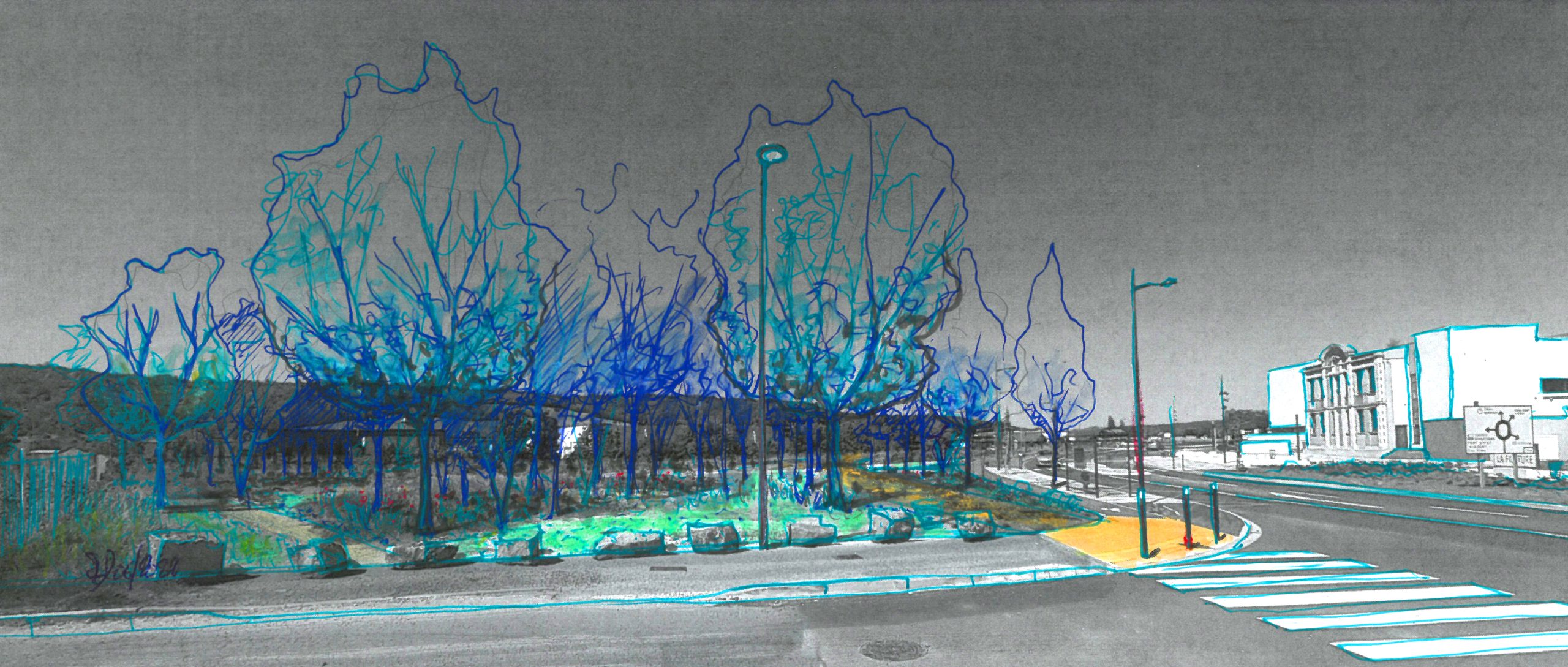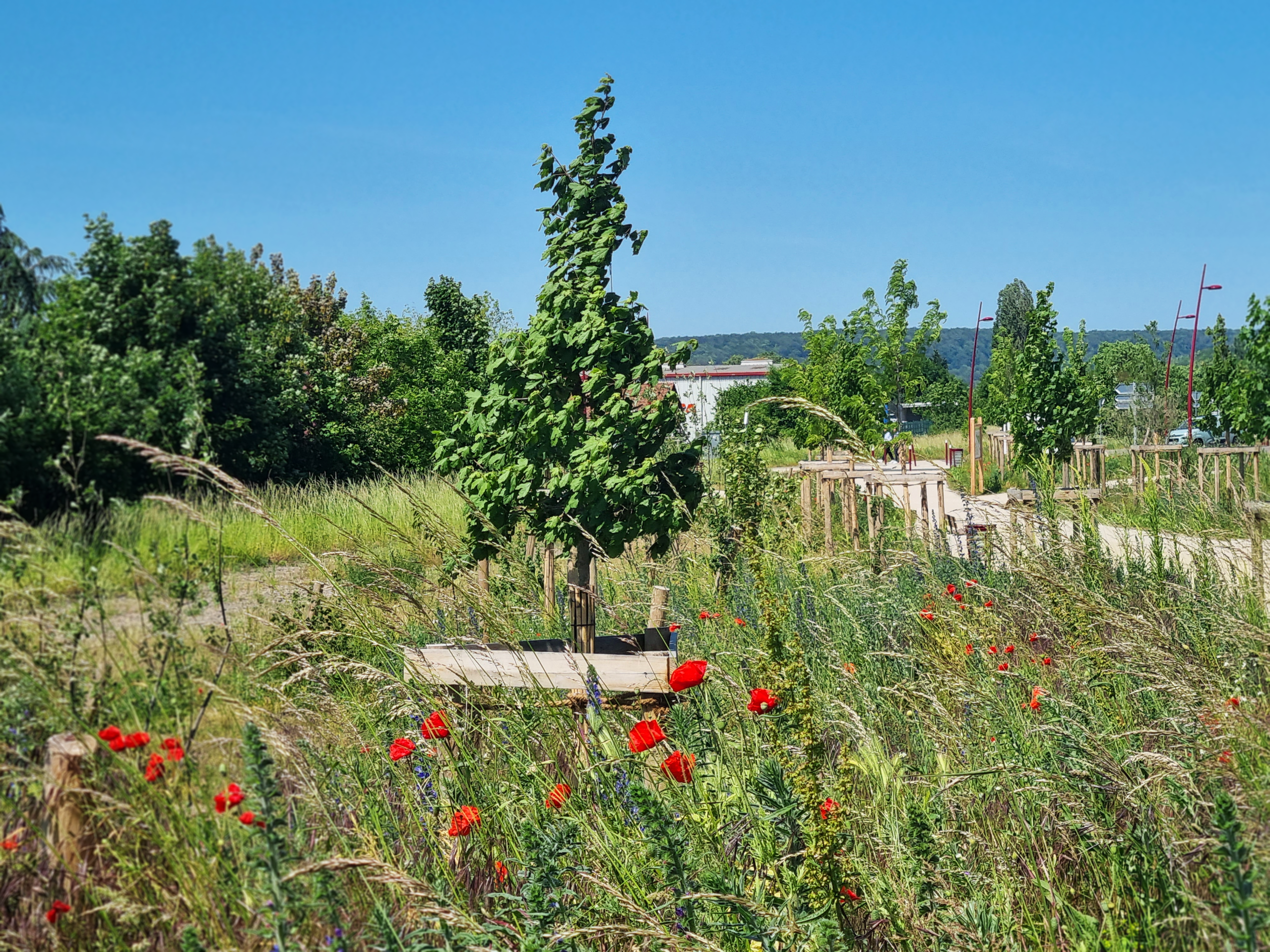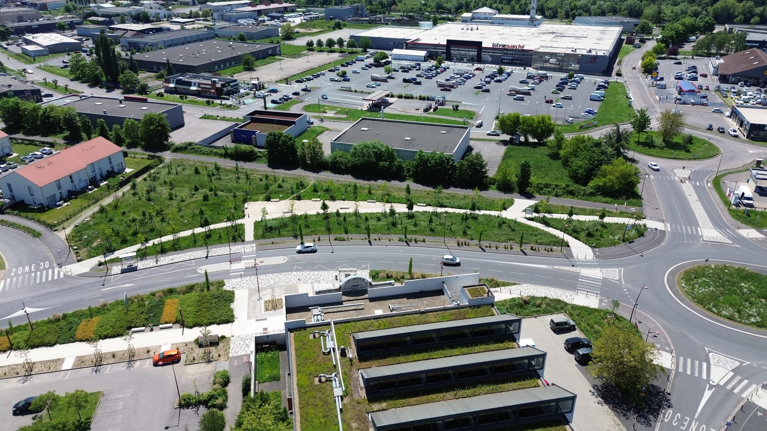 Les objectifs sont : – de créer un écrin de verdure au carrefour de plusieurs entités urbaines et dispositifs de déplacement – d’apporter une diversité des ambiances avec un cadre arboré et ombragé pour la promenade, le repos, les loisirs – d’offrir au coeur de ville un lieu pour la biodiversité. – de finaliser l’entrée de ville et faire «lien» – d’insérer des usages dans les espaces végétalisés techniques (bassin de compensation de crue) L’îlot de Fraîcheur offre : – une promenade (en béton) en connexion avec le réseau piétonnier et cyclable du quartier – un espace de convivialité (en stabilisé) pour le repos et les loisirs libres muni d’une fontaine – Une trame arborée dense pensée sur différentes strates, plantée avec des sujets d’âges et forces variés – Mise en place d’une gestion différenciée pour les prairies spontanées (avec support de communication) – un projet de plantation avec le travail du sol en place sans import de terre végétal : reconstitution d’un sol vivant avec apport d’amendement organique et bio-dynamisation. Un Fit Park accessible à tous est installé dans un bassin à proximité de l’îlot et en lien avec la piscine intercommunale.