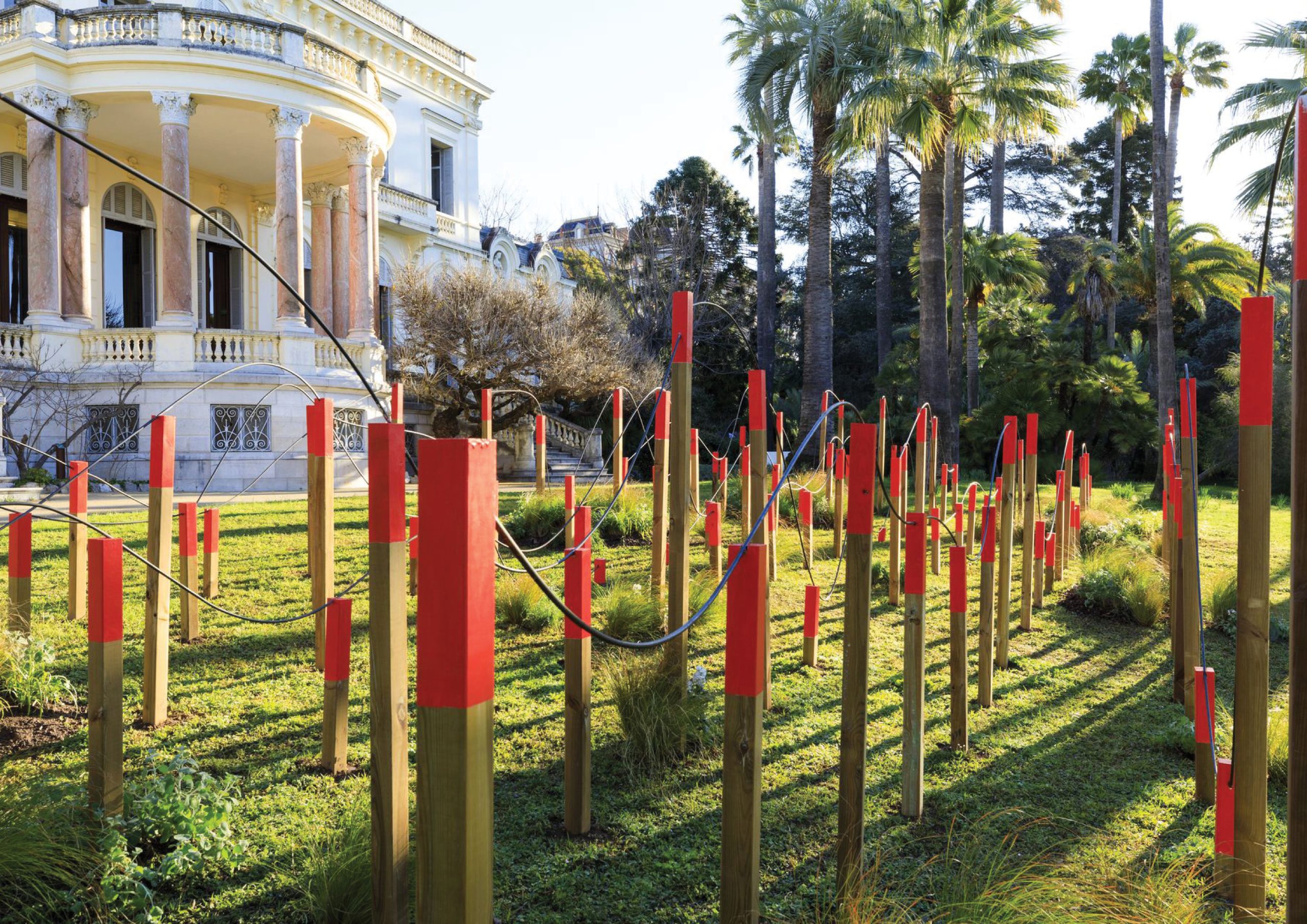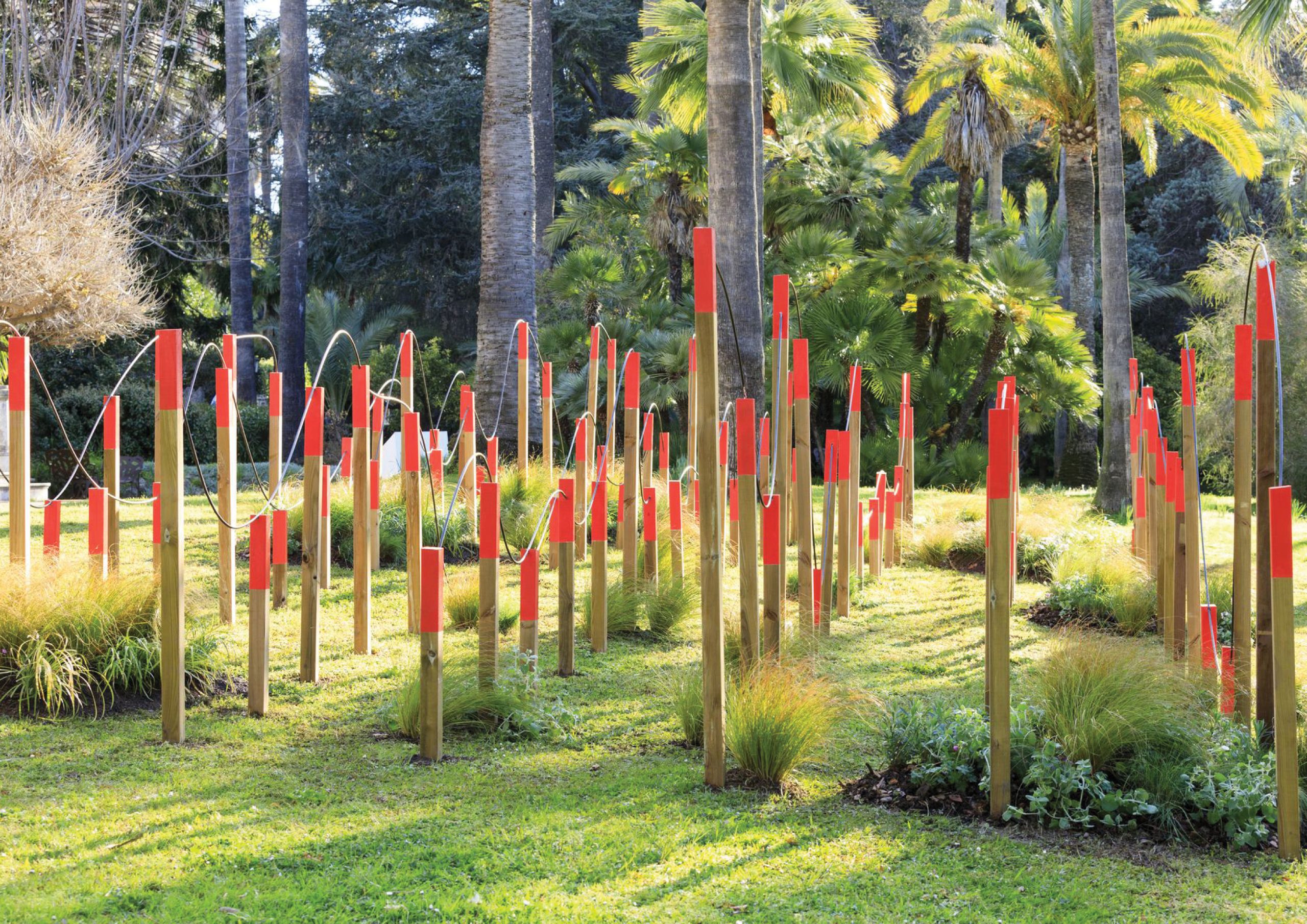 Les fers à béton, surplombant les têtes des poteaux coiffés d’un rouge vermillon, produisent non seulement un horizon changeant, mais renvoient également à la géographie escarpée de ce pays sud-alpin. La palette végétale accompagne les formes du jardin. En s’adossant aux poteaux dressés, les essences renforcent les variations de hauteur et, plantées de manière diffuse, évoque par l’absence la disparition d’un paysage vernaculaire façonné par l’Homme. Dernières vendanges est un jardin qui a été conçu avec l’idée de veiller au respect du site d’implantation, à l’aire naturelle dans laquelle il s’inscrit, et bien sûr à l’environnement.