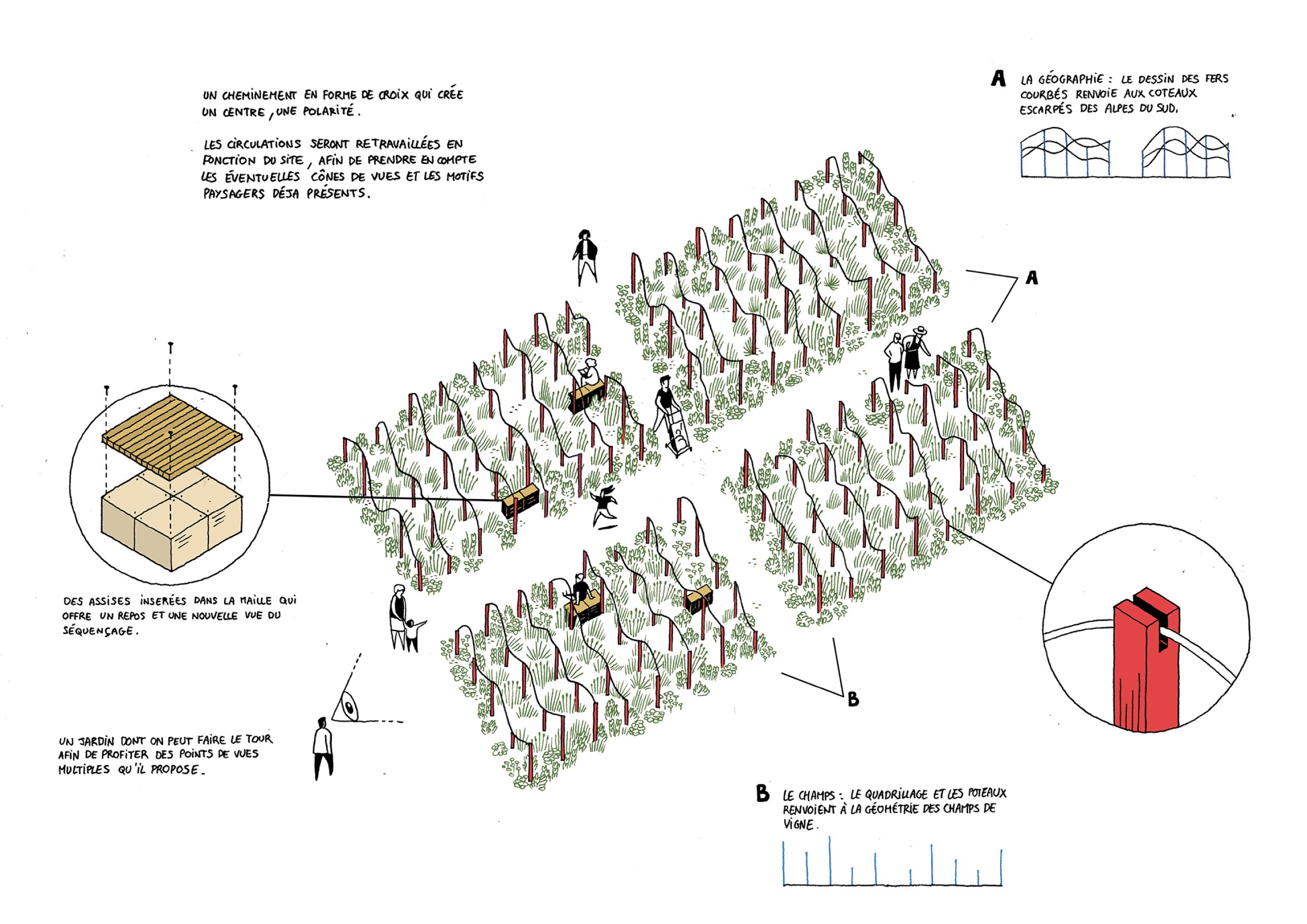 Ce jardin rend hommage au vignoble des Alpes du Sud, pratiquement disparu après la crise du phylloxéra. La vigne était immanquablement associée aux villages d’altitude, tandis qu’un vignoble familiale, typiquement montagnard en termes de climat et de sols, faisait la fierté de tout un pays. En reprenant le motif des piquets soutenant la vigne et en les réagençant, le séquençage offre des perspectives infinies, et des jeux d’ombre et de lumière multiples qui inscrivent le corps du visiteur dans la spatialité à mesure qu’il avance dans le jardin.