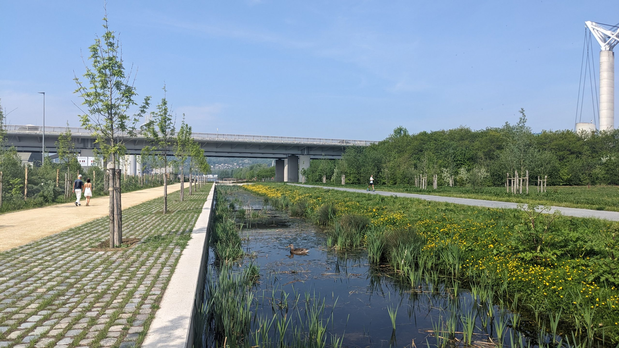Le renouvellement urbain de grandes emprises libérées de l’activité industrialo-portuaire, aux portes du centre historique de Rouen, offre l’opportunité d’élargir le coeur métropolitain au sud de la Seine et d’y constituer une nouvelle centralité. Le cadre exceptionnel en bords de Seine, les vues remarquables sur la cathédrale, les coteaux boisés et les falaises calcaires, la présence d’importantes emprises ferroviaires à reconvertir et de voies de circulation accueillant un trafic d’agglomération, permettent de façonner un projet singulier tirant parti de ces atouts et contraintes. L’opération Flaubert par l’ambition durable métropolitaine affirmée, nous a conduit à inventer des dispositions urbaines, paysagères et de mobilité alternative, à même de constituer un écoquartier. Le Projet des bords de Seine est lauréat du Grand prix du paysage en 2018. Photos : Landscape.fr / F. Côté