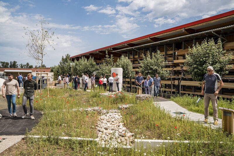Sur la base d’une étude paysagère menée à l’échelle du site et de son environnement, un projet d’aménagement a été soigneusement élaboré sur un temps long (01/2022  11/2023). Il s’est nourri des échanges et expertises de nombreux partenaires. L’aboutissement voit la totale transformation de 20 ares de friche infertile (remblais) en un îlot paysager accueillant. Grace aux travaux réalisés durant l’hiver et le printemps 2024, on peut accéder aujourd’hui à un parcours pédagogique combinant découvertes des techniques GIEP (avec Showroom) et de gestion raisonnée des espaces paysagers. Si les usages restent clairement localisés (showroom, espace formation Catec, espace détente), l’aménagement paysager permet de donner une identité forte à l’ensemble et de proposer un support commun propice à plus de biodiversité. Verger, prairie fleurie, jardin forêt, massifs plantés, haies vives sont autant d’espaces de vie et de perméabilité venant en complément des techniques illustrées dans le showroom (arbre, jardin de pluie, noues paysagères,…) Les cheminements accessibles PMR présentent à la fois un échantillon de revêtements perméables, guident les visiteurs vers les supports pédagogiques GIEP en tailles réelles (noues, cloisonnements, ouvrages, …), vers les tables et espaces de démonstrations et constituent une promenade bucolique permettant d’accéder aux espaces de détente (pique-nique, pétanque, ping-pong,…). • 20 ares, 260m de parcours pédagogiques. • 21 arbres, 900 arbustes, 200 vivaces, 150 variétés de végétaux. 80% labelisés « Végétal Local » ou issus de pépinières à – de 30km. 1500m² de surfaces ensemencées en prairie messicole. 350m² de sablé ensemencé. • 600m3 de matériaux issus et valorisés directement sur site • 15 revêtement perméables en situation réelle • 30 ateliers pédagogiques