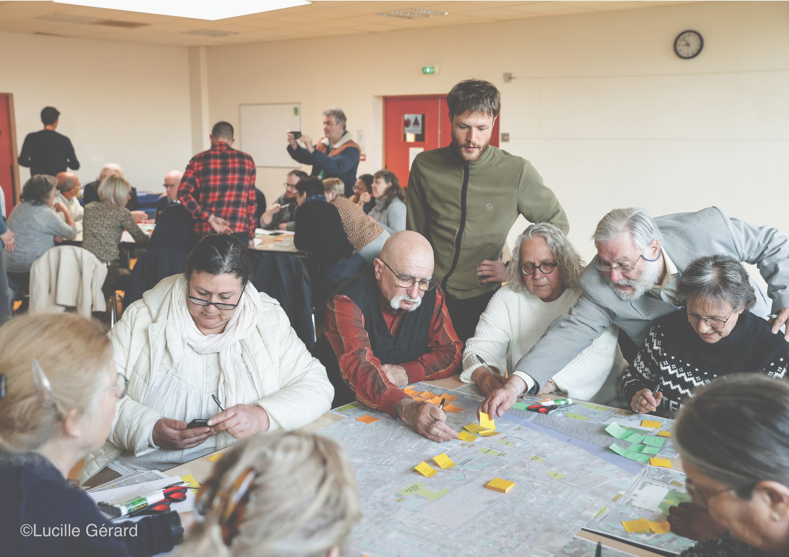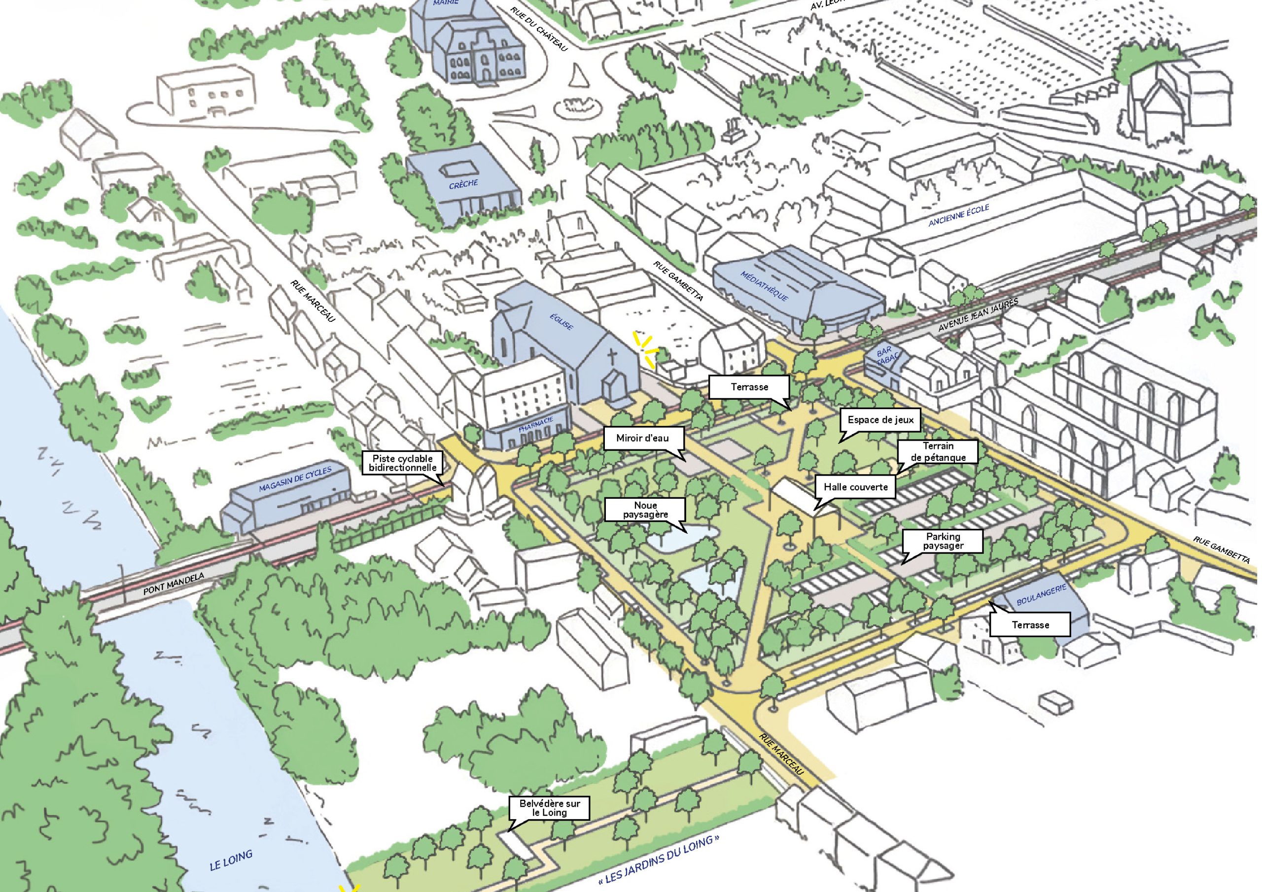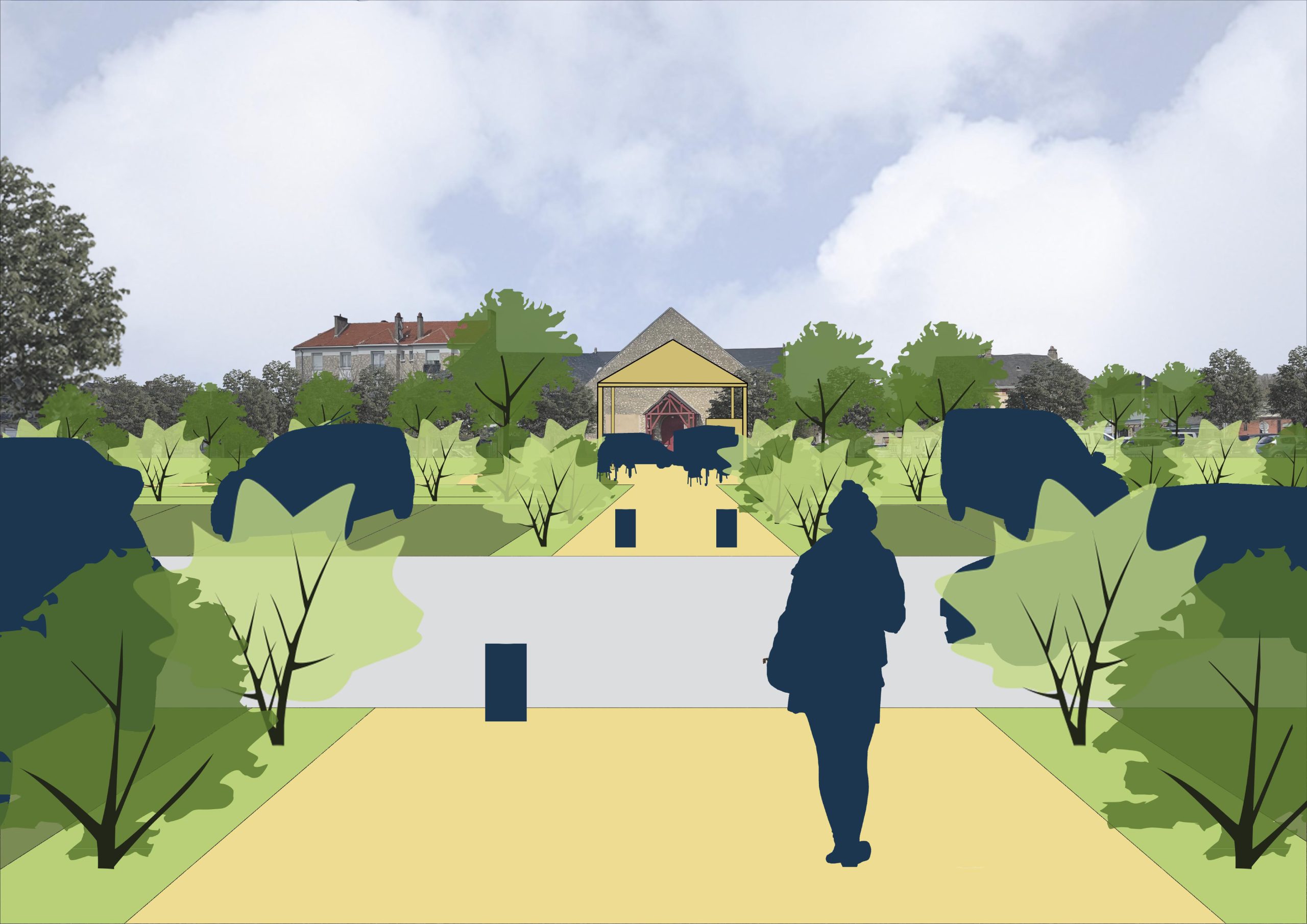 L’étude interroge également la mutation de la place Jean Jaurès, une centralité aujourd’hui dédiée principalement à du stationnement où trône un kiosque désuet au milieu d’une vaste prairie bordée de tilleuls taillés en tête de chat. Le projet redéfinit les usages de la place autour d’un parking décentré et optimisé, d’une halle légère servant au marché et aux événements festifs et de nouvelles trames végétales structurant le site. L’ensemble recrée les conditions d’un centre-bourg vivant, apaisé et résilient.