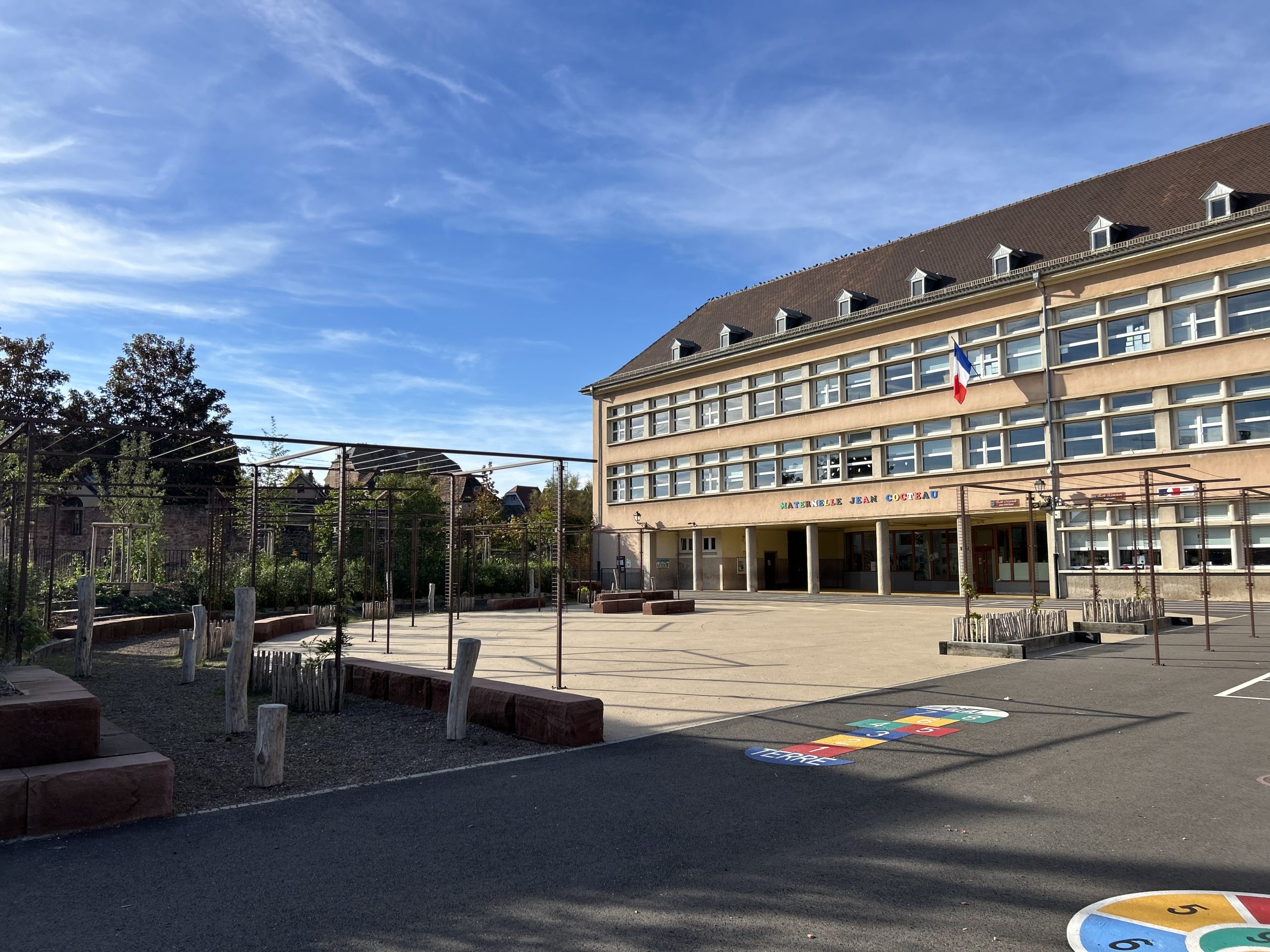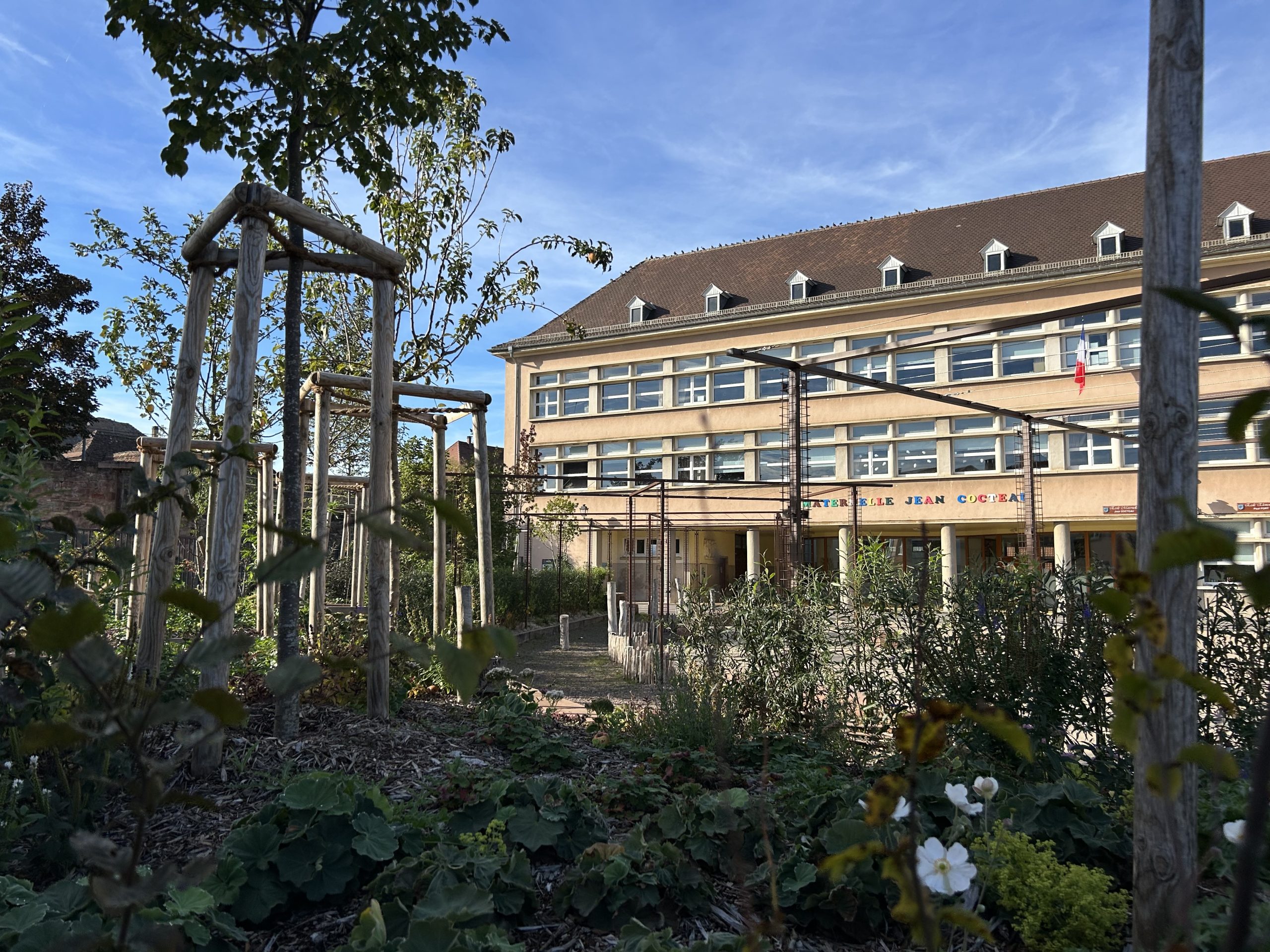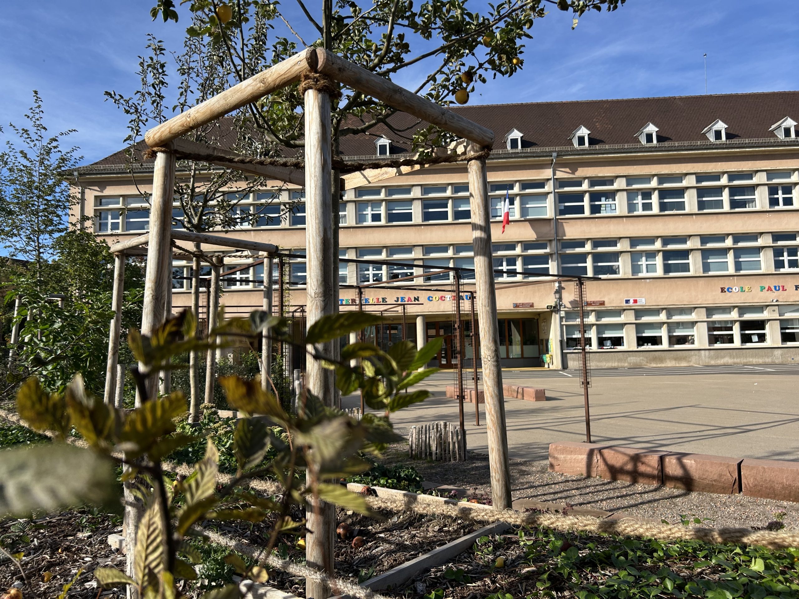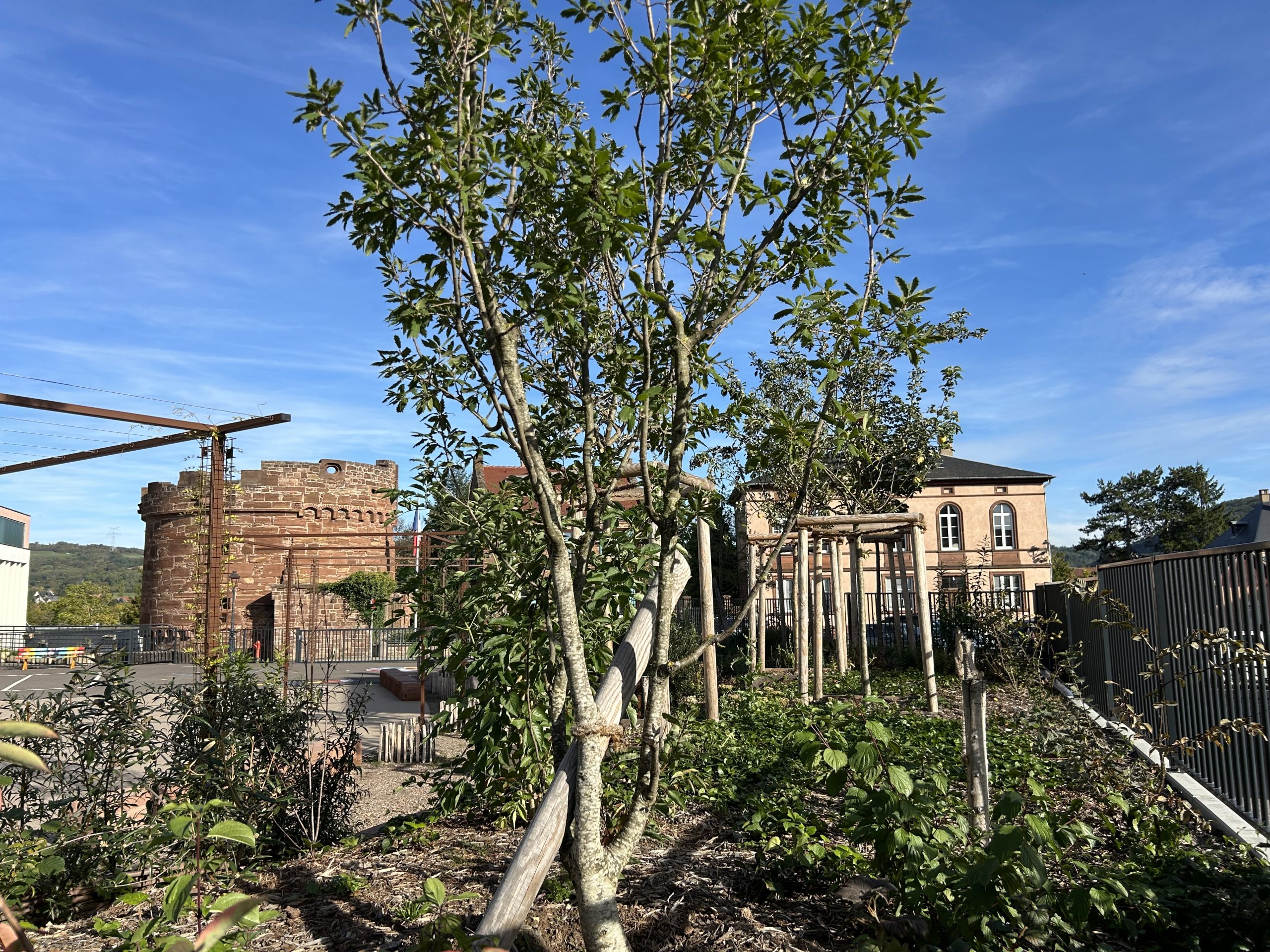 Après une étude de faisabilité technique et pour donner suite aux résultats positifs des sondages archéologiques le projet de déminéralisation est revu de fond en comble pour maintenir nos objectifs initiaux : déminéralisation, ombrage, lutte contre les ilots de chaleurs… le tout sans décaper les sols en places sur plus de 15cm d’épaisseur afin de préserver les vestiges archéologiques sous-jacents. Avec l’accord des services de la DRAC, l’ABF et le maitre d’ouvrage nous transformons toute la périphérie de la cour en une large haie dense, surélevée retenue par un jeu de fascines de saule vivant et de gradins de grès. Un réseau de pergolas complète et porte la végétalisation plus avant vers le cœur de la cour.
