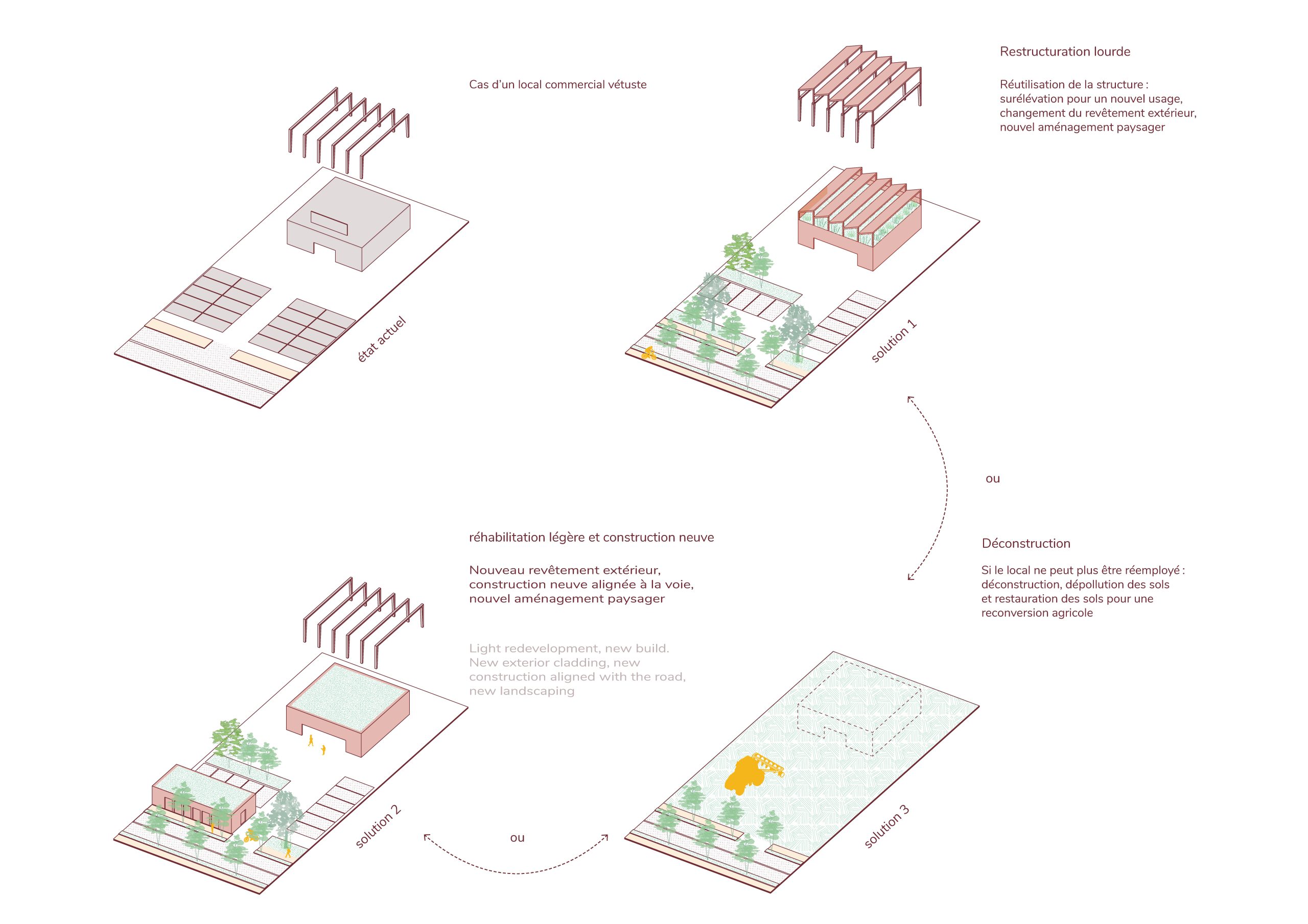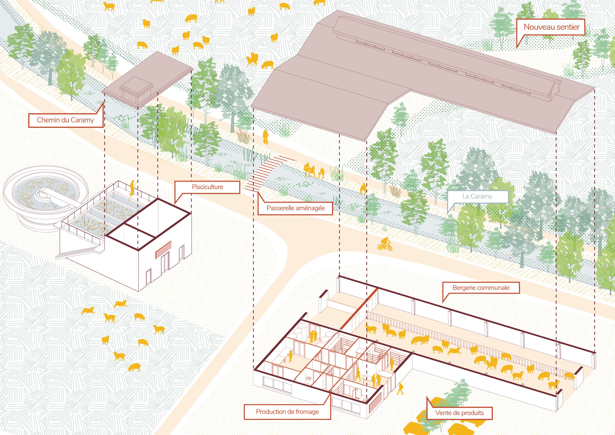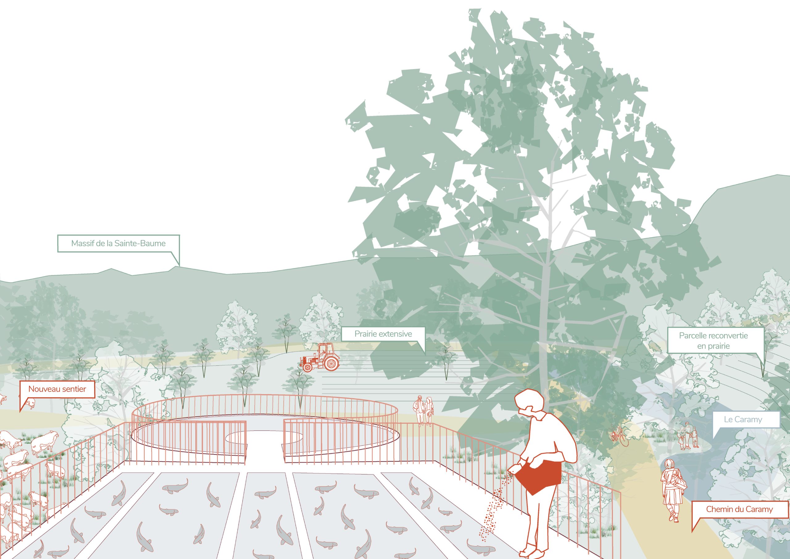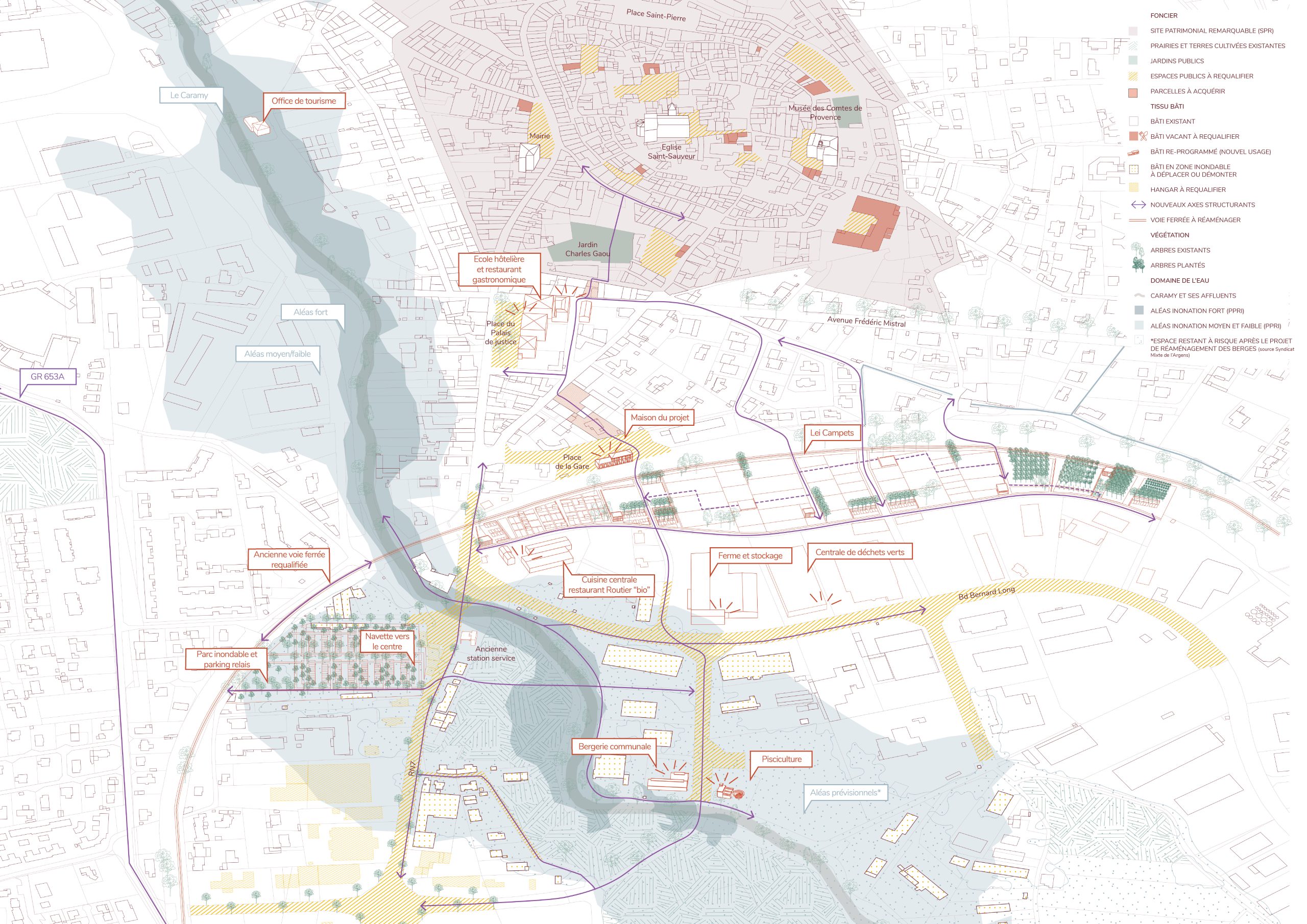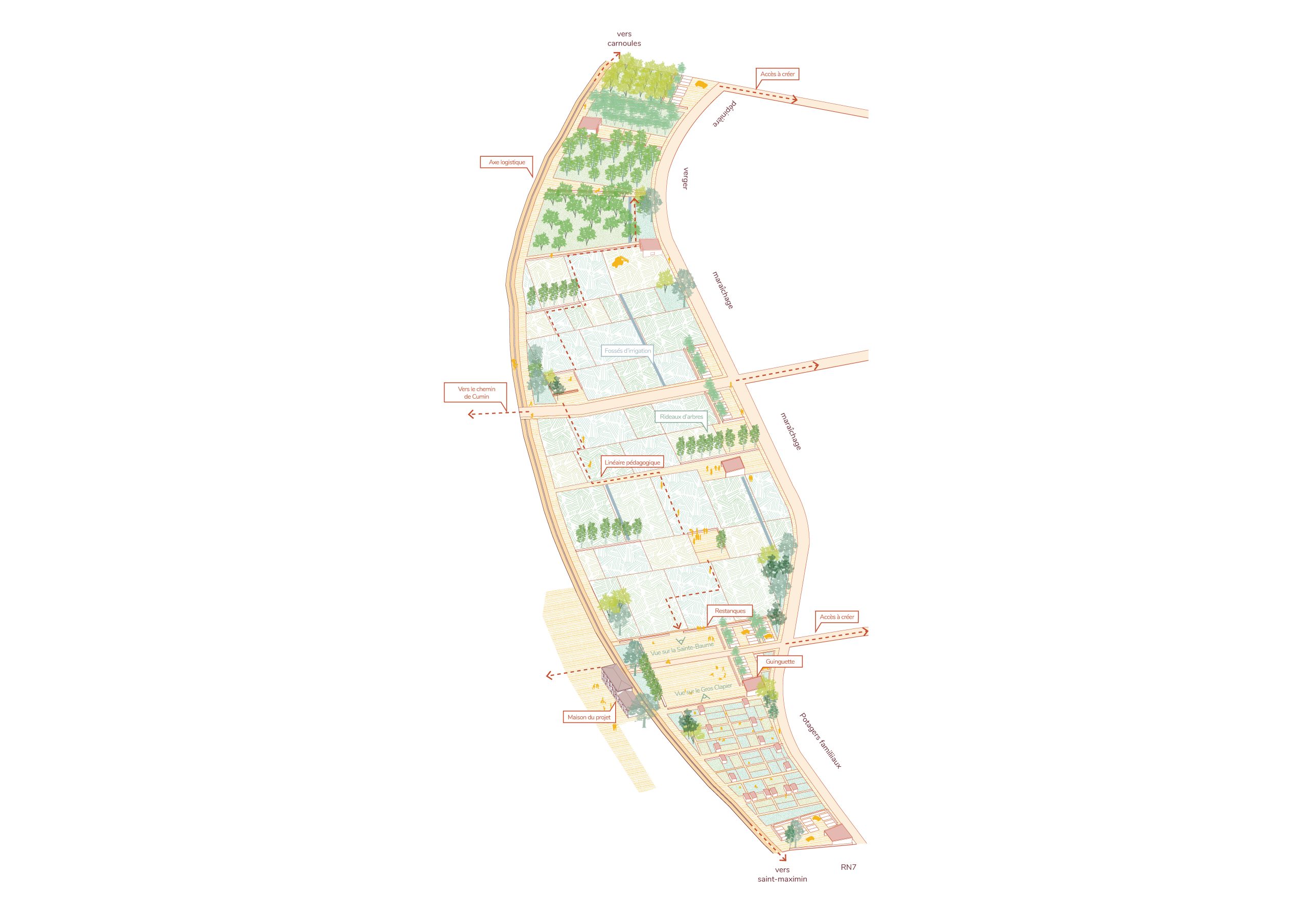 À Brignoles, les franges urbaines marquées par les zones commerciales des Consacs et de Saint-Jean, vulnérables aux crues du Caramy, offrent aujourd’hui un potentiel de reconversion majeur. Ces espaces, hérités d’un urbanisme routier et standardisé, contrastent avec le paysage provençal et fabriquent une rupture avec le centre ancien. Le projet propose de transformer cette contrainte en ressource en faisant du risque d’inondation un levier de recomposition. Progressivement, à mesure que des parcelles se libèrent, ces zones imperméabilisées sont renaturées et réinvesties par l’agriculture vivrière, dessinant une ceinture fertile.