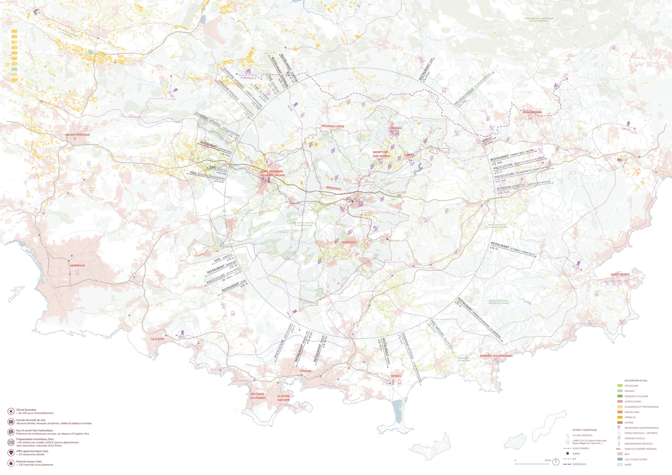 Sur l’ancienne friche ferroviaire, le parc agricole « Lei Campets » devient l’élément de couture, reliant centre-ville et périphérie, support logistique et réseau de promenades. Les sols, régénérés grâce aux déblais du Caramy, accueillent potagers familiaux, exploitations paysannes et espaces conviviaux. Cette reconversion productive redonne cohérence au territoire : en périphérie, elle structure de nouvelles dynamiques agricoles et écologiques ; au centre, elle réactive ses places par l’émergence d’échoppes gourmandes. Vitrine vivante de l’agriculture provençale, Brignoles se réinvente ainsi autour de son sol, renouant avec son identité nourricière et affirmant son rôle de capitale agronomique et gastronomique de la Provence Verte.