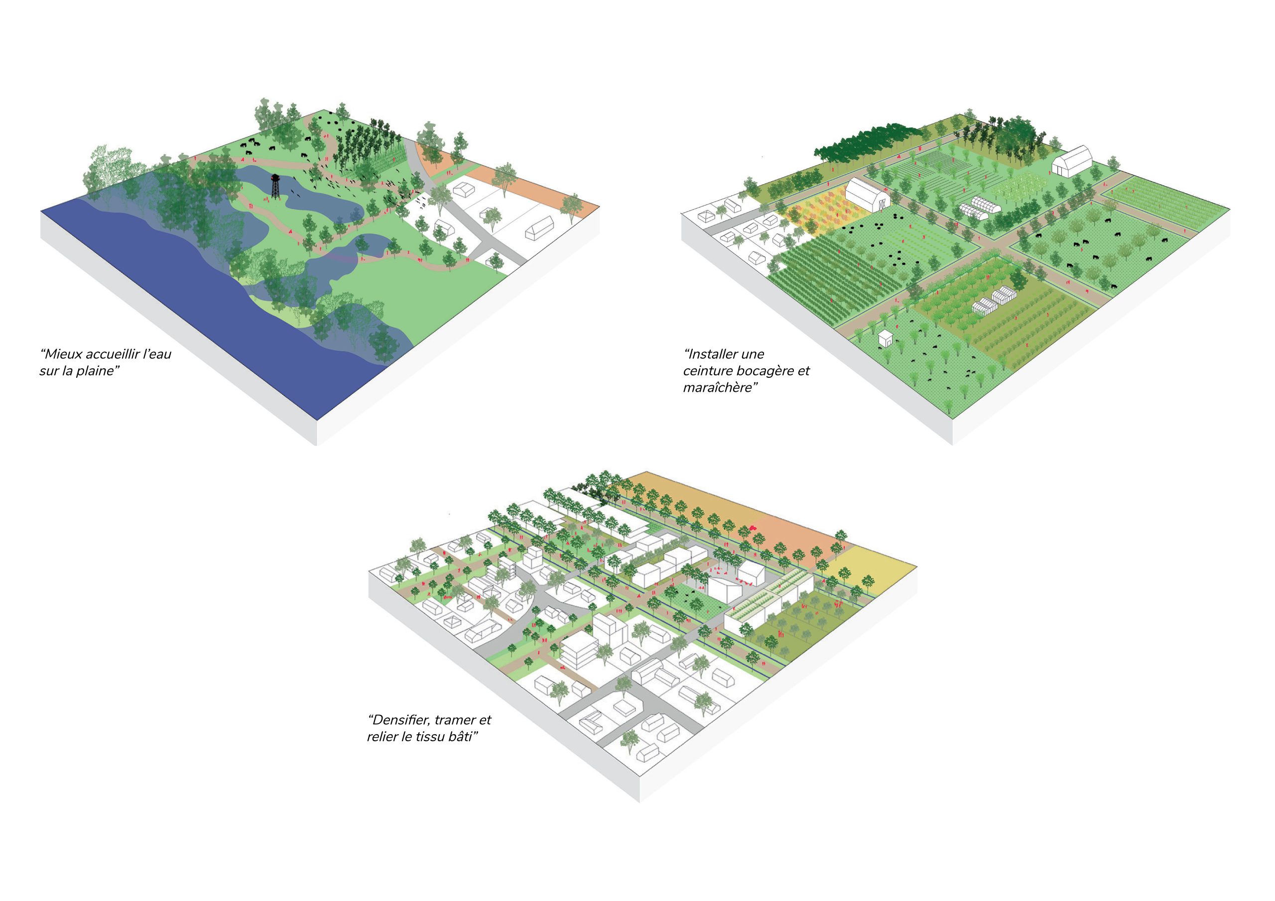Face à ces constats, les orientations proposées visent à engager une transition du territoire en s’appuyant sur le paysage comme levier de projet. Elles encouragent la revalorisation des milieux naturels, notamment liés au Rhône, l’évolution vers des pratiques agricoles plus diversifiées et durables, ainsi qu’une recomposition des formes urbaines plus denses, mixtes et mieux connectées. Une attention particulière est également portée aux continuités écologiques et aux interfaces entre espaces bâtis et agricoles. Enfin, le projet cherche à renforcer l’attractivité du territoire en proposant de nouveaux cadres de vie plus qualitatifs et résilients. Ainsi, l’implantation du projet EPR2 devient l’opportunité d’initier une transformation plus large, visant à améliorer la qualité de vie et à renforcer la résilience du territoire.