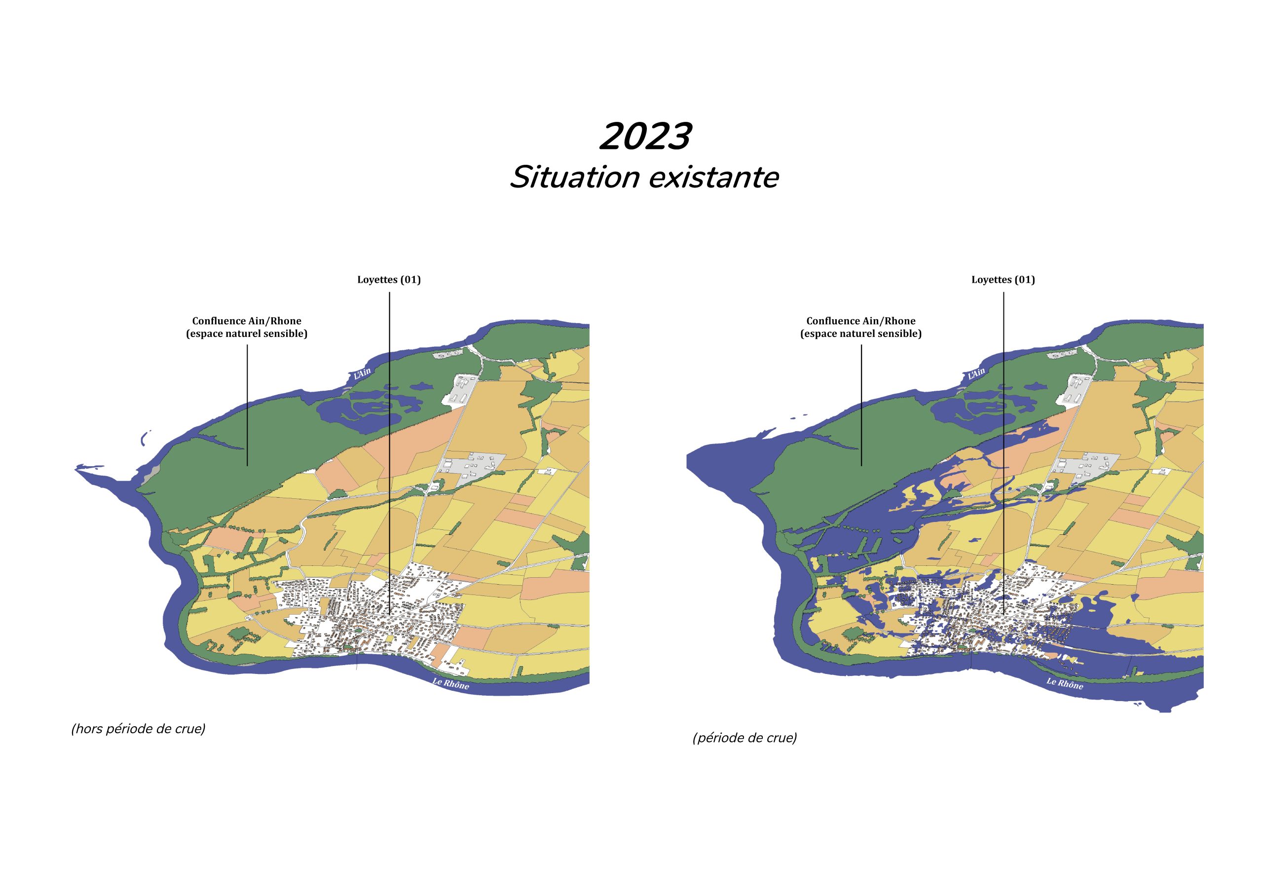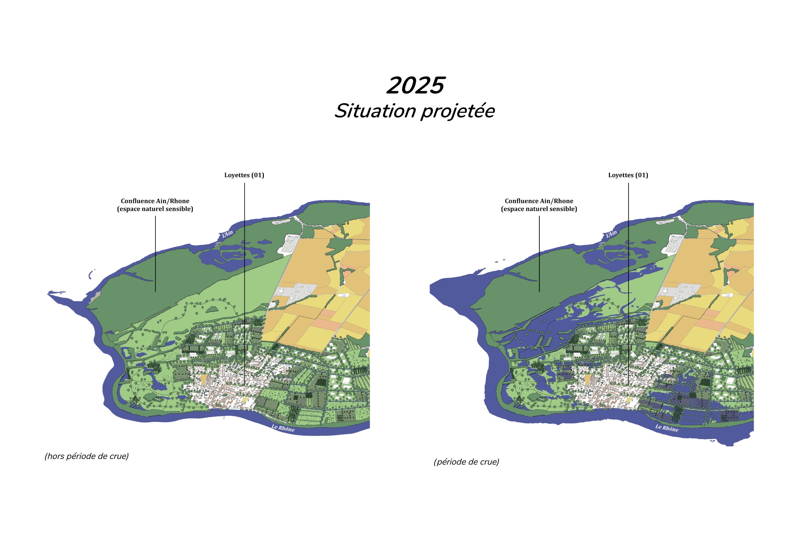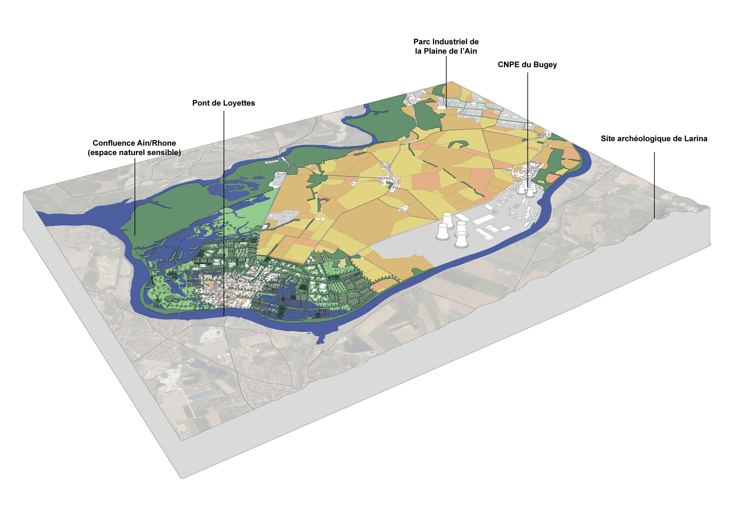 Dans le cadre de la construction d’un EPR2 sur le site du CNPE du Bugey, à proximité de Loyettes, une réflexion paysagère a été menée afin d’accompagner les transformations induites par ce projet industriel et de nourrir les mesures compensatoires dans une approche territoriale globale. L’étude développe des scénarios prospectifs à l’horizon 2050, en anticipant l’arrivée d’environ 7 600 salariés et les pressions associées sur le territoire. Elle met en évidence plusieurs fragilités existantes : une agriculture intensive, des espaces naturels limités, une forte dépendance à la voiture et un tissu urbain diffus marqué par l’étalement.