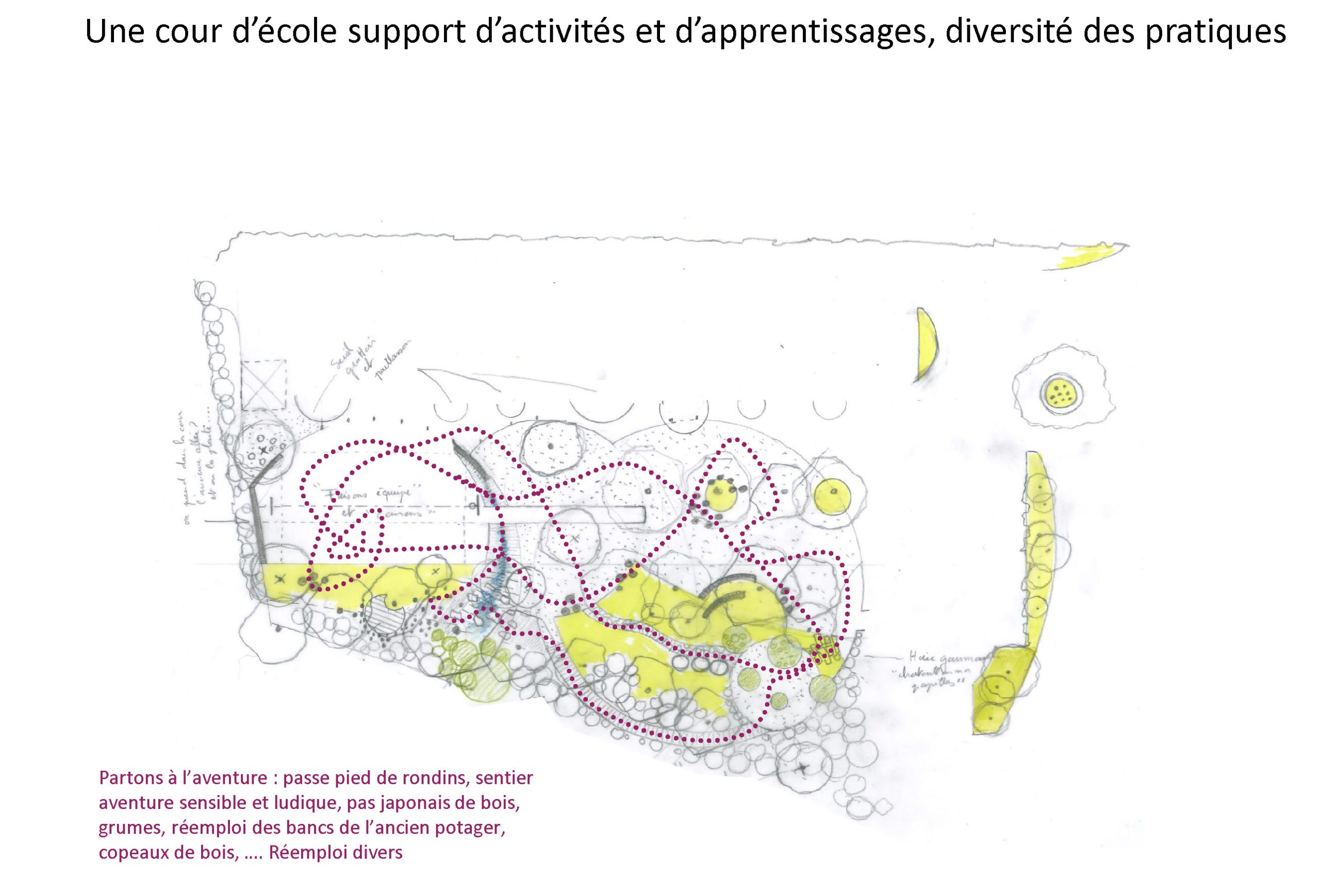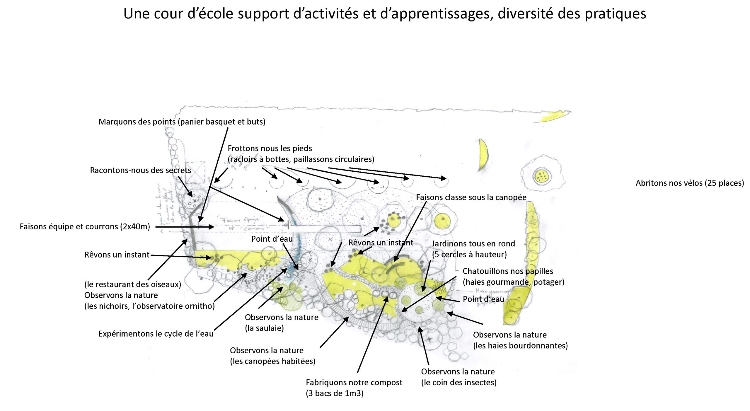 La nouvelle cour proposera une grande diversité d'activités : * faisons classe sous la canopée * chatouillons nos papilles * jardinons tous en rond * racontons-nous des secrets * rêvons un instant * partons à l'aventure * faisons équipe et courons * abritons nos vélos * frottons nous les pieds avant d'entrer Un nouveau support d'éducation et de sensibilisation à l'environnement : * expérimentons le cycle naturel de l'eau * observons la nature * réemploi et frugalité