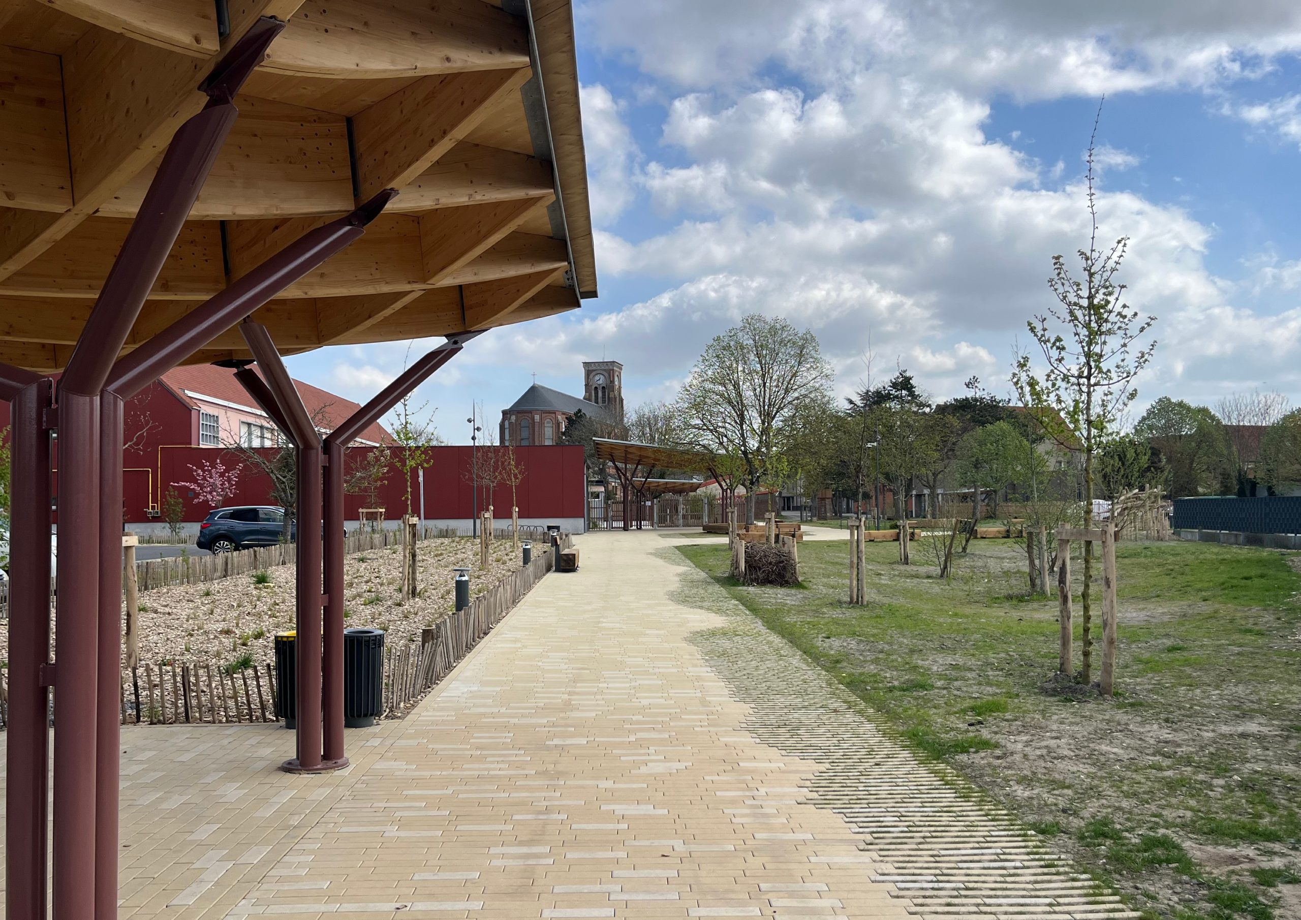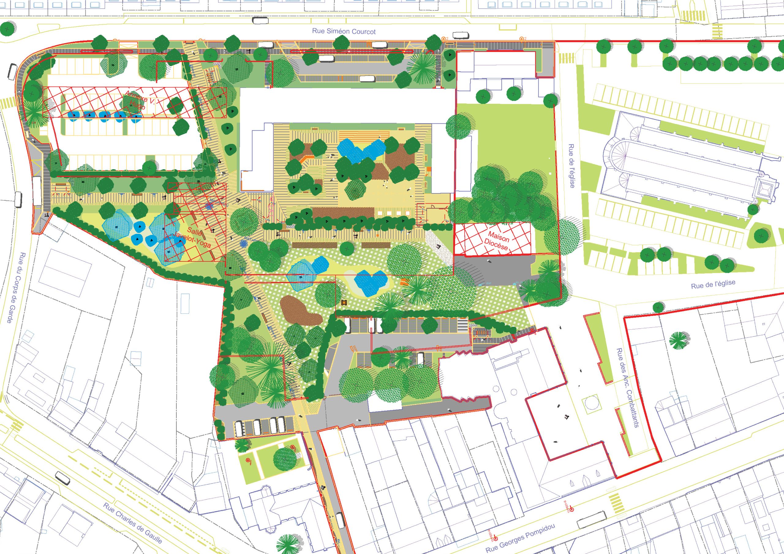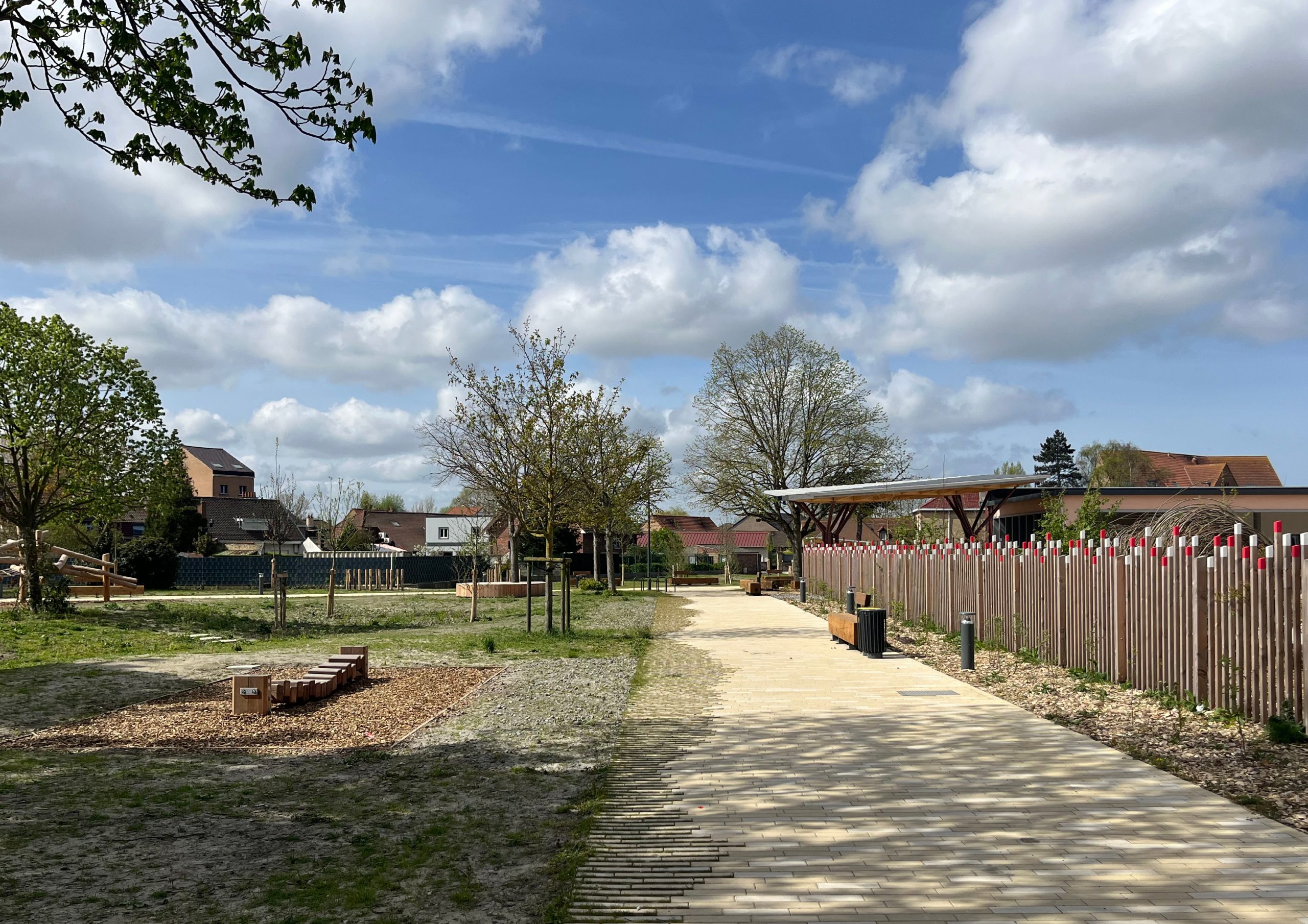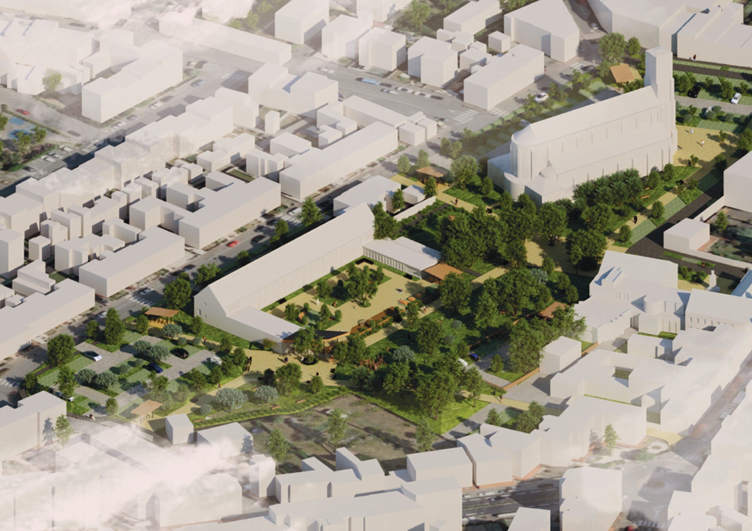 L’ensemble du site est conçu comme un parc dont la trame piétonne – articulée par plusieurs placettes – forme l’armature du projet. Plusieurs « chambres paysagères » sont desservies et reliées par ces magistrales. En périphérie, les aires de stationnement sont optimisées et végétalisées. En cœur de parc, le tamponnement des eaux est mis en scène par une large noue franchissable. La cour de l’école communale est requalifiée dans un esprit de continuité avec le nouveau parc en cœur de ville.