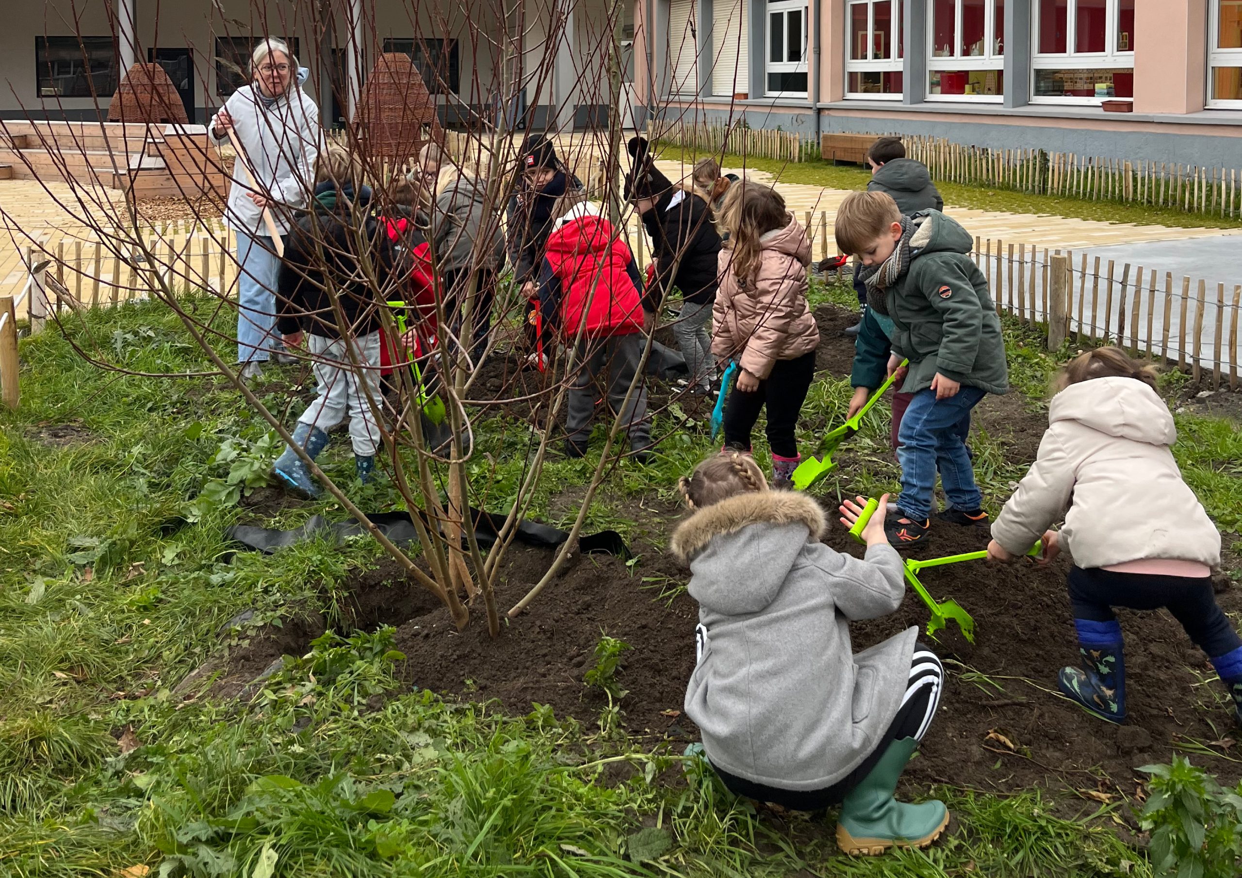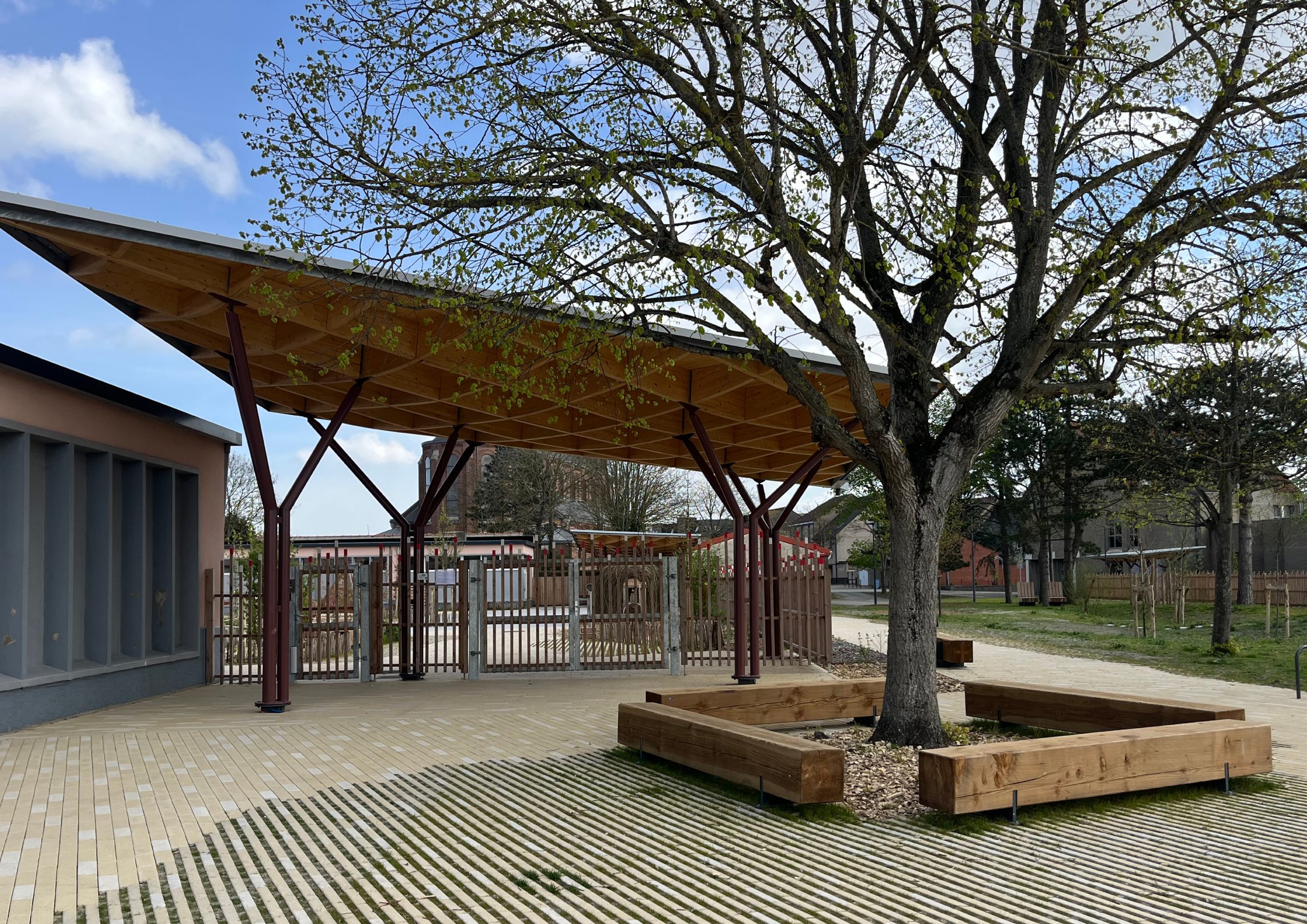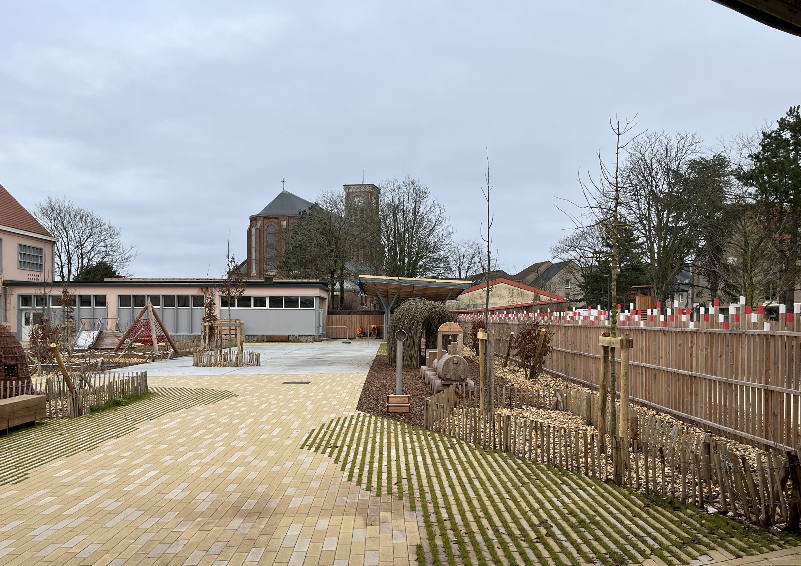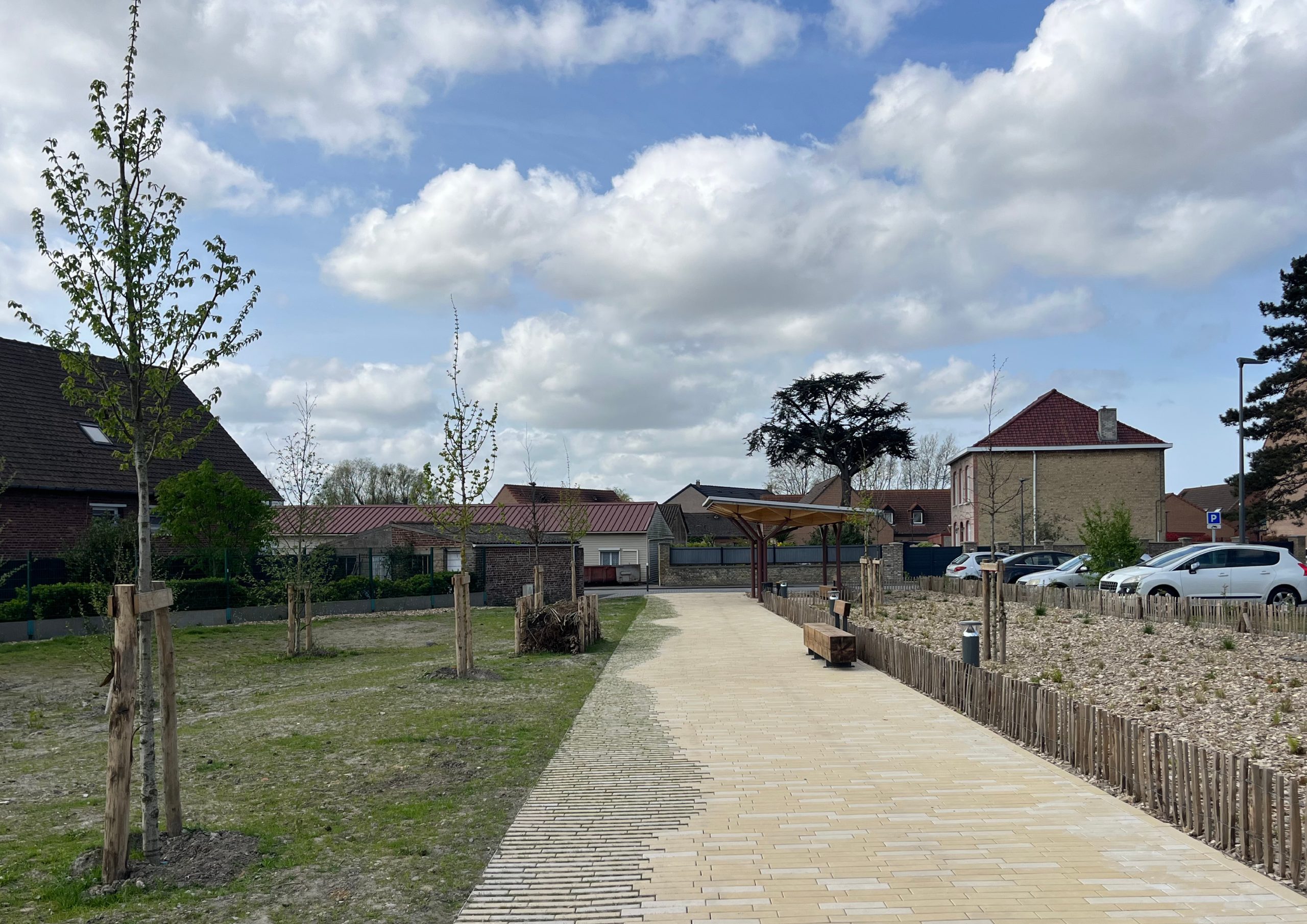 L’ensemble du site est conçu comme un parc dont la trame piétonne – articulée par plusieurs placettes – forme l’armature du projet. Plusieurs « chambres paysagères » sont desservies et reliées par ces magistrales. En périphérie, les aires de stationnement sont optimisées et végétalisées. En cœur de parc, le tamponnement des eaux est mis en scène par une large noue franchissable. La cour de l’école communale est requalifiée dans un esprit de continuité avec le nouveau parc en cœur de ville.