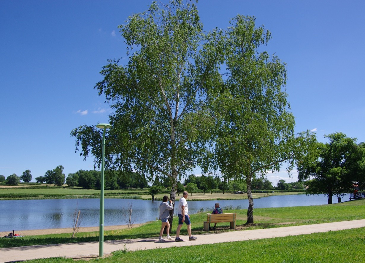 Les plages en sables sont fortement réduites pour laisser place à des espaces enherbés et plantés. La gestion du couvert herbacé est un élément de re-composition du projet pour conduire le site d’un espace jardiné à un plan d’eau renaturé.
