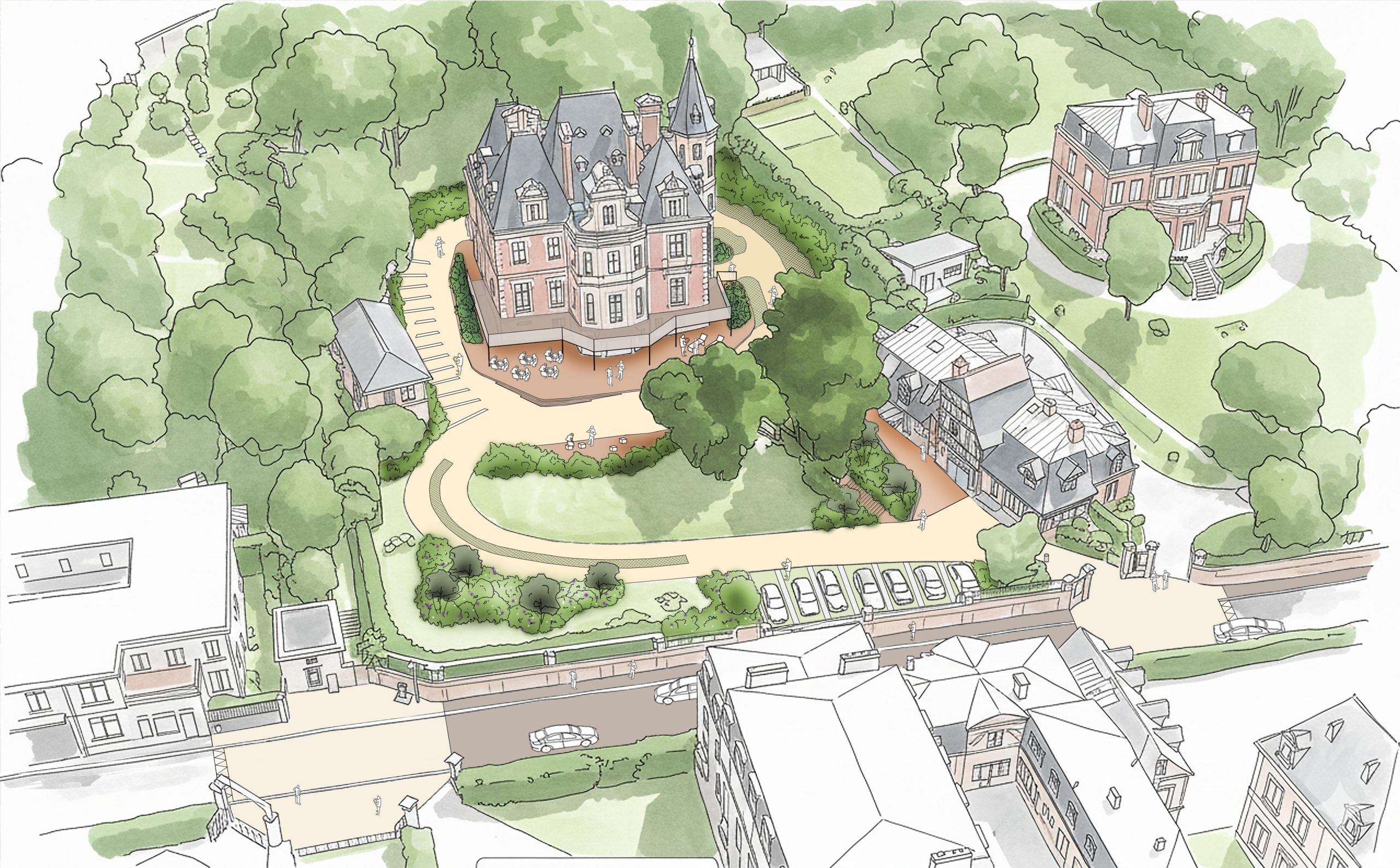 Le principal enjeu de la recomposition du parc de la Villa Montebello, musée municipal de Trouville, est de préserver et de magnifier son rôle de poumon vert face à la densité urbaine de Trouville-sur-Mer. Ce n’est pas qu’un simple jardin, c’est une oasis de tranquillité qui doit offrir un contrepoint essentiel à l’effervescence balnéaire. En lien avec l’architecte du patrimoine François Pougheol qui a la charge de la restauration de la Villa et notamment la reconstitution de la coursive, la composition des abords s’attachera à constituer un socle unifiant la fonctionnalité complexe d’un site comme celui de la Villa.