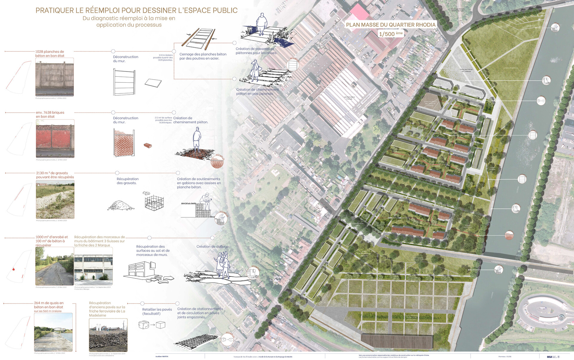 Extraction, transformation, utilisation, destruction : ce schéma de consommation de masse est présent partout autour de nous. Nos ressources finies sont puisées d’une manière infinie. Ce modèle n’est plus soutenable. D’un côté nous exploitons nos ressources naturelles, de l’autre nous accumulons des déchets. Dans un même temps nos villes continuent de grandir et de s’étaler. Notre espace urbain ne peut pas être muséifié. Nous ne pouvons pas arrêter la construction de nos villes. Nous sommes obligés de faire muter notre environnement d’une manière plus durable et responsable. En prenant les matériaux juste avant ou juste après la démolition nous pouvons leur donner une seconde vie et les réemployer dans des projets. Le projet que je met en place sur la métropole lilloise s’ancre sur plusieurs friches industrielles du territoire pour venir créer un réseau d’aménagements supports d’une filière de réemploi de matériaux de construction (stockage, espace de dialogue entre les acteurs, construction, etc). En partant des qualités paysagères du territoire, de son histoire, de ses caractéristiques, et des matériaux locaux j’ai dessiné un projet métropolitain unique avec comme point central la création d’un quartier et d’une ressourcerie mélangés. Gestion de l’eau pluviale, pratique du réemploi, dé-imperméabilisation du sol, mixité sociale, préservation du paysage local sont autant de critères pris en compte dans la conception de ce projet.